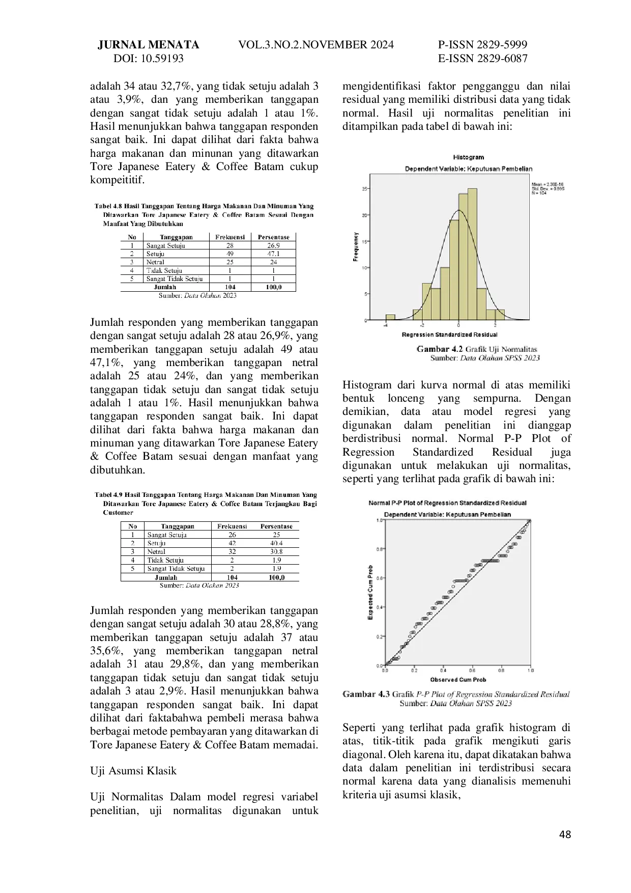 JURNAL MENATAJURNAL MENATACurrently, many restaurants and cafes are emerging and growing in various locations, including in Batam. A restaurant is a place to eat with a variety of menus, while a cafe is essentially a place for discussion or relaxation that serves coffee and light snacks. Restaurants and cafes are more than just places for eating or drinking, but also serve as spaces for social interaction among visitors from different backgrounds. The purpose of this research is to determine whether price perception affects the purchasing decision at Tore Japanese Eatery Batam. This study uses a quantitative method. Price perception serves as the independent variable, and the purchasing decision serves as the dependent variable in this study. Data was collected through the distribution of questionnaires via Google Forms to 104 respondents, who are customers or buyers at Tore Japanese Eatery & Coffee Batam. Data analysis was conducted using SPSS Statistics 23. The results show that the t-test indicates that the price perception variable affects the purchasing decision. On the other hand, by comparing the purchasing decision with the table and calculation tests, it was found that price perception influences the purchasing decision. The results of simple regression analysis show that price perception has a 64.7% influence on the purchasing decision, while other variables not studied in this research have an influence of 35.3%.