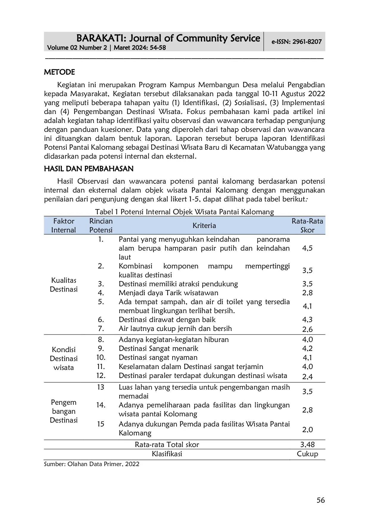 BARAKTI: Journal of Community ServiceBARAKTI: Journal of Community ServiceKecamatan Watubangga, Kabupaten Kolaka merupakan desa pesisir yang memiliki potensi luar biasa, baik dari segi kerukunan bermasyarakat, pendidikan, maupun pariwisata. Hal ini didukung oleh beberapa potensi pasar dari Kampus Universitas Sembilanbelas November Kolaka, Bandar Udara Sangia Nibandera, dan merupakan jalan poros penghubung Kabupaten Kolaka dan Kabupaten Bombana. Oleh karena itu, potensi pantai Kalomang perlu diidentifikasi karena merupakan destinasi wisata baru yang memiliki banyak pengunjung dari masyarakat Kabupaten Kolaka, Kabupaten Kolaka Timur, dan Kabupaten Bombana. Kegiatan ini merupakan pengabdian kepada masyarakat melalui Kampus Membangun Desa bermitra dengan Pemerintah Lura Watubangga dengan tema identifikasi potensi pantai Kalomang sebagai destinasi wisata baru di Kecamatan Watubangga. Kegiatan ini bertujuan untuk mengetahui potensi wisata pantai Kalomang melalui metode observasi dan wawancara.