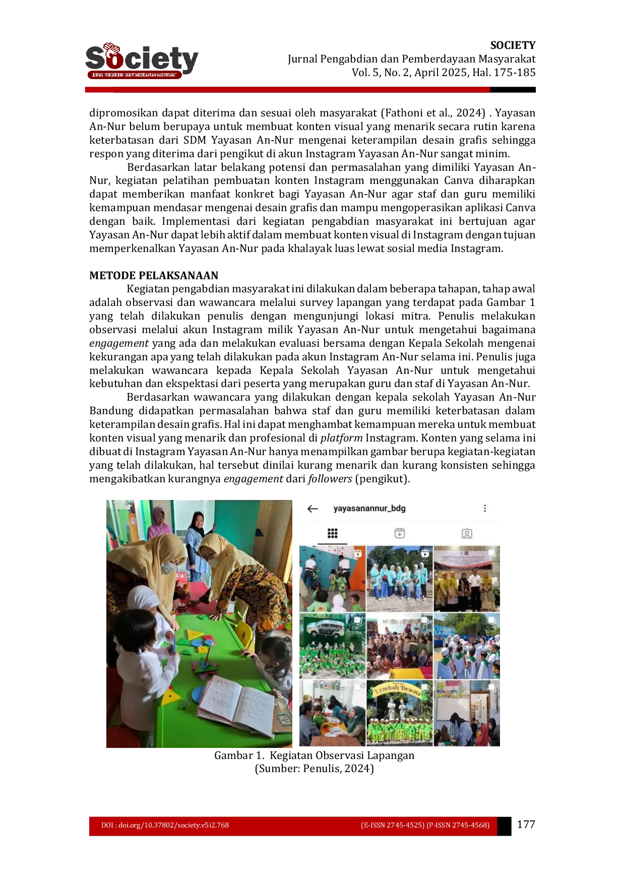 Society : Jurnal Pengabdian dan Pemberdayaan MasyarakatSociety : Jurnal Pengabdian dan Pemberdayaan MasyarakatDigitalisasi telah mengubah paradigma komunikasi institusi pendidikan, memperluas peran media sosial sebagai alat strategis untuk memperluas jangkauan dan meningkatkan interaksi dengan masyarakat. Kegiatan pengabdian masyarakat yang meliputi pelatihan dalam membuat Instagram menggunakan aplikasi Canva untuk staf dan guru Yayasan An-Nur dalam konteks digitalisasi yang menyebar ke dunia pendidikan. Pelatihan ini bertujuan untuk memperkuat keterampilan staf dan guru di Yayasan An-Nur dalam membuat konten visual yang menarik dan relevan, yang dapat mendukung upaya yayasan dalam mempromosikan misinya agar lebih dikenal secara luas. Metode pelatihan meliputi presentasi materi dan sesi praktik langsung menggunakan aplikasi Canva yang disesuaikan dengan kebutuhan konten Instagram Yayasan An-Nur. Dengan menggunakan aplikasi Canva sebagai alat utama, peserta pelatihan didorong untuk mengadopsi teknologi yang mudah digunakan untuk mengelola konten Instagram secara efektif. Hasil evaluasi menunjukkan peningkatan kompetensi peserta dalam memanfaatkan media sosial sebagai sarana komunikasi yang efektif dan strategis. Berdasarkan hasil posttest, 90% peserta memahami materi yang disajikan dan 75% peserta dapat menerapkan hasil pelatihan dengan menggunakan aplikasi Canva secara mandiri untuk membuat konten Instagram.