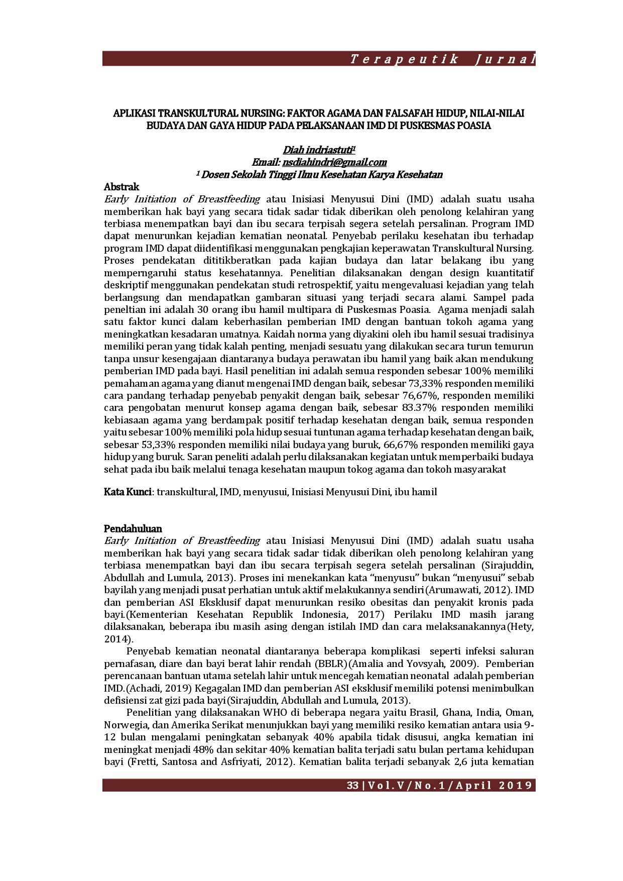 TERAPEUTIK JURNAL : Jurnal Ilmiah Ilmu Keperawatan dan Kedokteran KomunitasTERAPEUTIK JURNAL : Jurnal Ilmiah Ilmu Keperawatan dan Kedokteran KomunitasEarly Initiation of Breastfeeding atau Inisiasi Menyusui Dini (IMD) adalah suatu usaha memberikan hak bayi yang secara tidak sadar tidak diberikan oleh penolong kelahiran yang terbiasa menempatkan bayi dan ibu secara terpisah segera setelah persalinan. Program IMD dapat menurunkan kejadian kematian neonatal. Penyebab perilaku kesehatan ibu terhadap program IMD dapat diidentifikasi menggunakan pengkajian keperawatan Transkultural Nursing. Proses pendekatan dititikberatkan pada kajian budaya dan latar belakang ibu yang memperngaruhi status kesehatannya. Penelitian dilaksanakan dengan design kuantitatif deskriptif menggunakan pendekatan studi retrospektif, yaitu mengevaluasi kejadian yang telah berlangsung dan mendapatkan gambaran situasi yang terjadi secara alami. Sampel pada peneltian ini adalah 30 orang ibu hamil multipara di Puskesmas Poasia. Agama menjadi salah satu faktor kunci dalam keberhasilan pemberian IMD dengan bantuan tokoh agama yang meningkatkan kesadaran umatnya. Kaidah norma yang diyakini oleh ibu hamil sesuai tradisinya memiliki peran yang tidak kalah penting, menjadi sesuatu yang dilakukan secara turun temurun tanpa unsur kesengajaan diantaranya budaya perawatan ibu hamil yang baik akan mendukung pemberian IMD pada bayi. Hasil penelitian ini adalah semua responden sebesar 100% memiliki pemahaman agama yang dianut mengenai IMD dengan baik, sebesar 73,33% responden memiliki cara pandang terhadap penyebab penyakit dengan baik, sebesar 76,67%, responden memiliki cara pengobatan menurut konsep agama dengan baik, sebesar 83.37% responden memiliki kebiasaan agama yang berdampak positif terhadap kesehatan dengan baik, semua responden yaitu sebesar 100% memiliki pola hidup sesuai tuntunan agama terhadap kesehatan dengan baik, sebesar 53,33% responden memiliki nilai budaya yang buruk, 66,67% responden memiliki gaya hidup yang buruk. Saran peneliti adalah perlu dilaksanakan kegiatan untuk memperbaiki budaya sehat pada ibu baik melalui tenaga kesehatan maupun tokoh agama dan tokoh masyarakat.