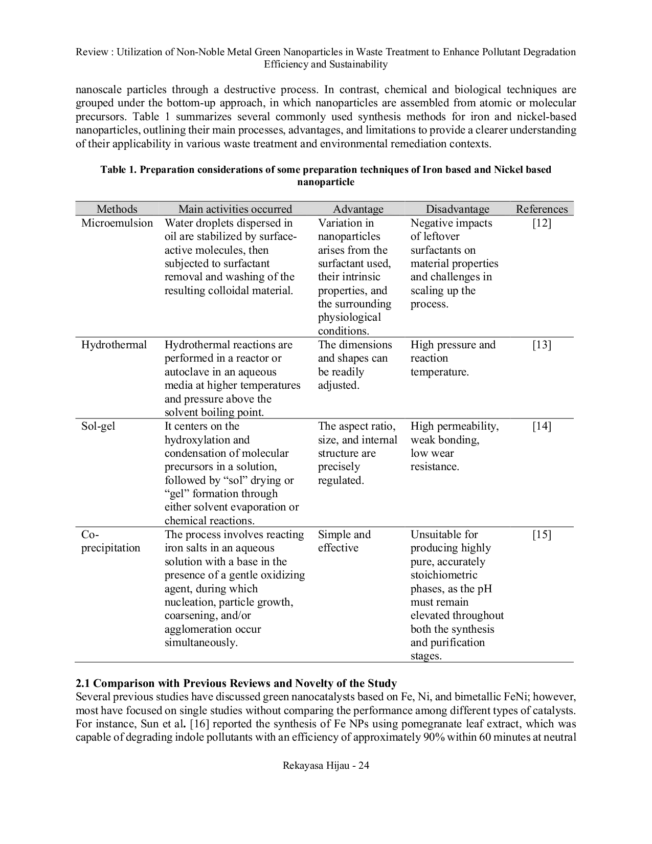 Rekayasa Hijau : Jurnal Teknologi Ramah LingkunganRekayasa Hijau : Jurnal Teknologi Ramah LingkunganKebutuhan yang meningkat akan teknologi degradasi polutan yang berkelanjutan dan efektif telah memicu minat pada nanoteknologi hijau sebagai solusi yang layak. Kajian ini menekankan penggunaan nanopartikel hijau logam non-mulia dalam aplikasi pengolahan limbah, yang menunjukkan kemampuannya untuk meningkatkan efisiensi degradasi polutan sekaligus memastikan keberlanjutan lingkungan. Topik utama yang dibahas mencakup metode sintesis yang menggunakan agen pereduksi alami dan ramah lingkungan, karakteristik fisikokimia nanopartikel logam non-mulia, dan mekanisme katalitiknya dalam berbagai proses pengolahan limbah. Studi perbandingan menyoroti manfaat logam Fe dan Ni, seperti efektivitas biaya, kelimpahan, dan dampak lingkungan yang lebih rendah. Paper ini juga mengkaji studi kasus yang menunjukkan penguraian polutan organik dan logam berat menunjukkan penggunaan praktis bahan-bahan ini. Tantangan seperti stabilitas, skalabilitas, dan potensi risiko lingkungan dianalisis secara menyeluruh, bersama dengan prospek masa depan untuk mengatasi hambatan ini. Tinjauan ini berupaya memberikan pemahaman terperinci tentang bagaimana nanopartikel hijau logam Fe dan Ni berkontribusi pada kemajuan teknologi pengolahan limbah berkelanjutan.