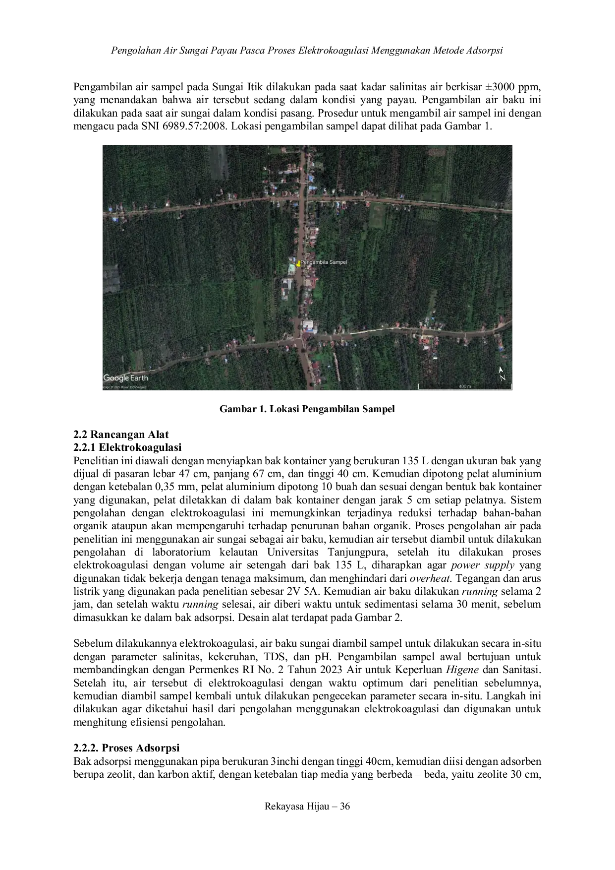 Pengolahan kombinasi elektrokoagulasi dan adsorpsi dapat menyisihkan kekeruhan hingga 86,75%, TDS hingga 9,40%, salinitas hingga 11,14%, serta menetralkan pH air sungai payau.Meskipun demikian, hasil pengolahan belum sepenuhnya memenuhi standar mutu air bersih untuk higiene dan sanitasi.Penelitian ini merekomendasikan variasi tegangan listrik dan waktu tinggal, kajian parameter ion spesifik, serta variasi jenis dan ketebalan adsorben untuk penelitian lebih lanjut.