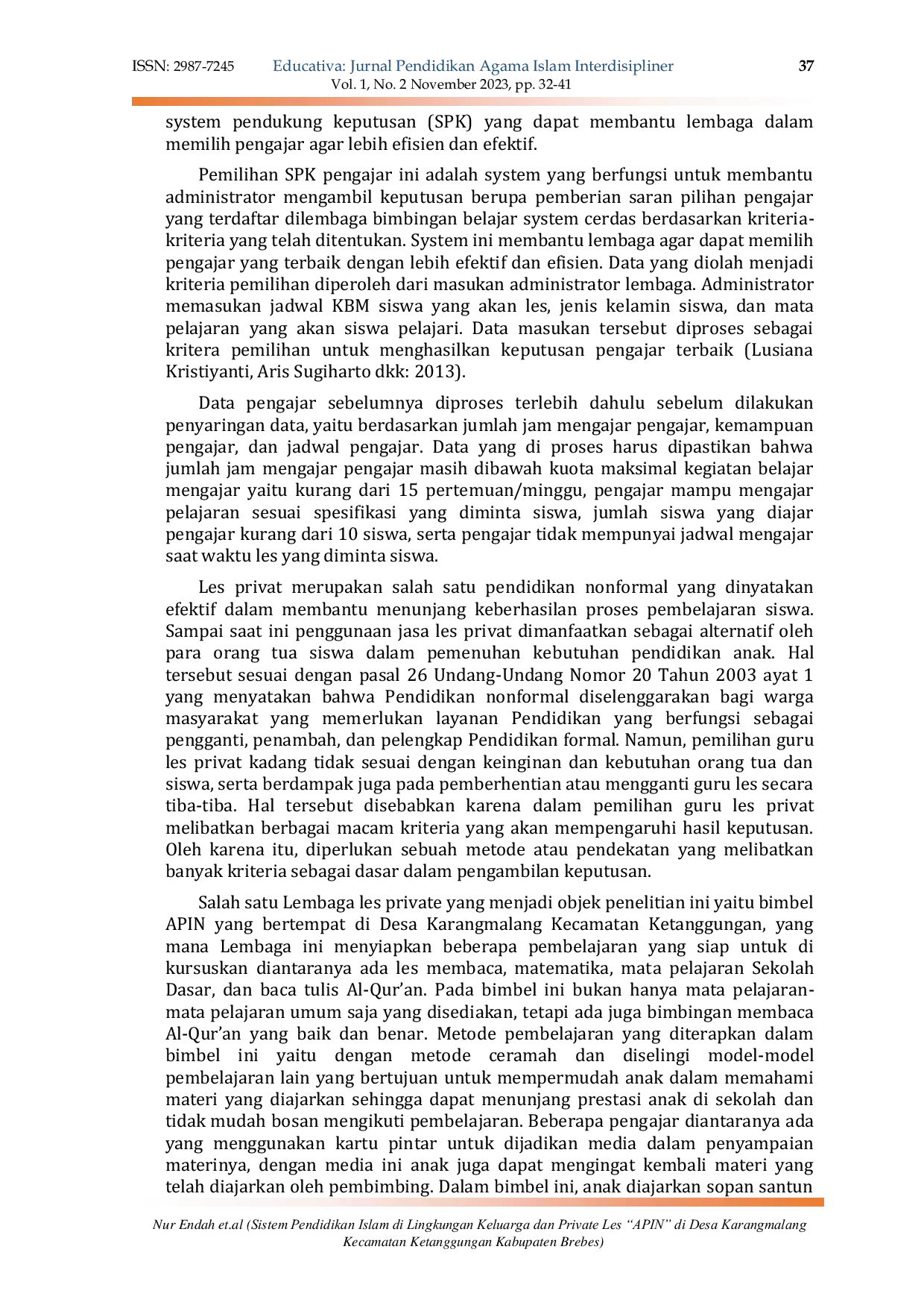 Educativa: Jurnal Pendidikan Agama IslamEducativa: Jurnal Pendidikan Agama IslamPenelitian ini menggunakan metode kualitatif dengan pendekatan field research (penelitian lapangan), yakni peneliti terjun langsung untuk melakukan penelitian pada objeknya untuk mendapatkan data hasil penelitian secara faktual. Dalam penelitian ini membahas tentang sistem pendidikan Islam dalam lingkup keluarga. Hal yang melatar belakangi penelitian ini, yaitu keluarga mempunyai peranan yang sangat penting dalam mendidik anaknya dan keluarga pula yang merupakan lembaga pendidikan Islam pertama bagi anaknya, karena anak lebih lama bersama dengan keluarga dibanding dengan gurunya di sekolah. Karakter anak juga akan terbentuk menjadi baik atau buruknya tergantung dari cara keluarga mendidik terutama orang tuanya. Keluarga merupakan tempat ternyaman bagi anak. Berawal dari keluarga segala sesuatu berkembang. Kemampuan untuk bersosialisasi, mengaktualisasikan diri, berpendapat, hingga perilaku yang menyimpang. Maka, pendidikan Islam di lingkungan keluarga sangatlah penting di terapkan dalam mendidik anak. Dalam melakukan pendidikan pada anak, orang tua juga dapat dengan memasukkan anak ke les privat agar anak dapat menyerap pendidikan-pendidikannya lebih luas. Dalam mendidik anak terkadang orang tua lebih sering salah faham jika anaknya sudah di masukkan pada suatu lembaga pendidikan orang tua beranggapan kalau dirinya sudah lepas tanggung jawab dalam memberikan didikan pada anak semua dibebankan di pihak lembaganya. Padahal seharusnya orang tua juga harus ikut mendukung anak dalam pendidikannya khususnya pendidikan Islamnya. Tujuan dari penelitian ini yaitu untuk memahami sistem pendidikan Islam di lingkungan keluarga, sehingga sebagai orang tua bisa menerapkan sistem ini kepada anaknya. Adapun hasil dari penelitian ini menyatakan bahwa keluarga khususnya orang tua sangatlah berperan dalam pendidikan anaknya agar anak dapat memperoleh pendidikan yang positif sehingga tercetak anak-anak yang baik. Orang tua juga dapat menitipkan anaknya di les privat harapannya agar anak bisa mendapatkan materi lebih yang tidak ia dapatkan dalam pendidikan keluarganya.