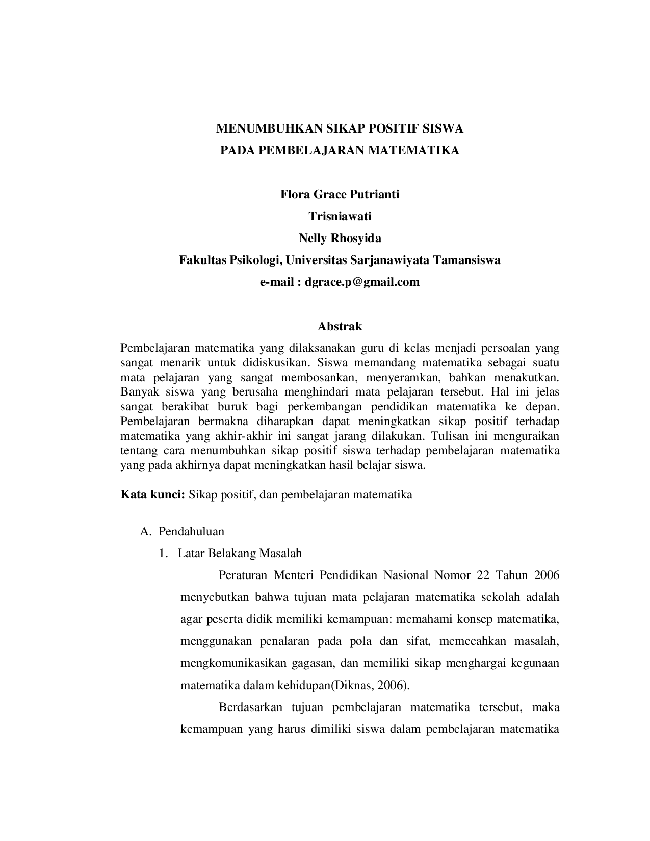 Personifikasi: Jurnal Ilmu PsikologiPersonifikasi: Jurnal Ilmu PsikologiPembelajaran matematika yang dilaksanakan guru di kelas menjadi persoalan yang sangat menarik untuk didiskusikan. Siswa memandang matematika sebagai suatu mata pelajaran yang sangat membosankan, menyeramkan, bahkan menakutkan. Banyak siswa yang berusaha menghindari mata pelajaran tersebut. Hal ini jelas sangat berakibat buruk bagi perkembangan pendidikan matematika ke depan. Pembelajaran bermakna diharapkan dapat meningkatkan sikap positif terhadap matematika yang akhir-akhir ini sangat jarang dilakukan. Tulisan ini menguraikan tentang cara menumbuhkan sikap positif siswa terhadap pembelajaran matematika yang pada akhirnya dapat meningkatkan hasil belajar siswa.