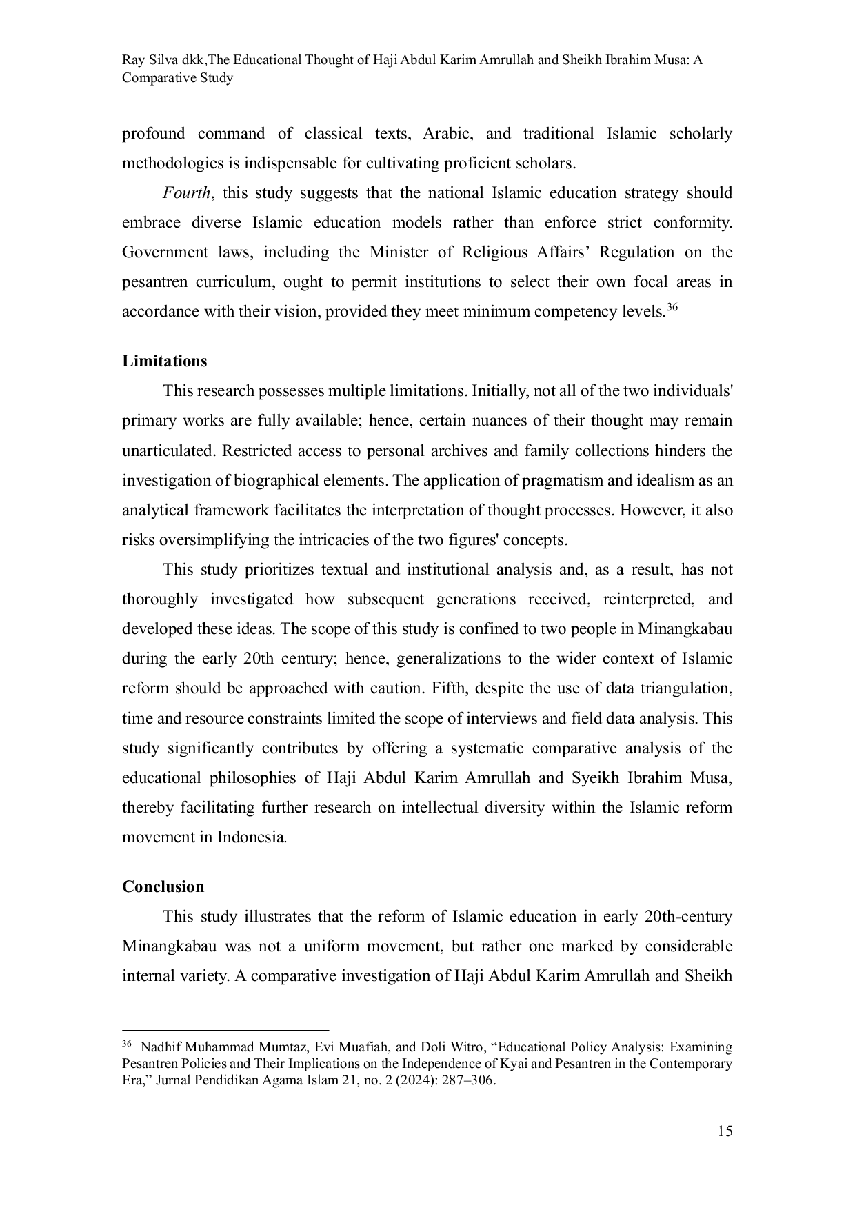 Studi ini menunjukkan bahwa reformasi pendidikan Islam di Minangkabau awal abad ke-20 bukanlah gerakan yang seragam, melainkan ditandai dengan keragaman internal yang signifikan.Perbandingan antara Haji Abdul Karim Amrullah dan Syekh Ibrahim Musa mengungkapkan bahwa meskipun memiliki garis keturunan intelektual yang sama, mereka tidak menghasilkan keseragaman, melainkan menghasilkan orientasi filosofis yang berbeda.Haji Abdul Karim Amrullah mengusulkan metodologi pragmatis yang menyoroti nilai sosial pengetahuan dan memasukkan teknik pengalaman, sedangkan Syekh Ibrahim Musa membina perspektif idealis yang berakar pada konsistensi penelitian Islam klasik.Temuan ini memiliki implikasi praktis bagi kemajuan pendidikan Islam modern di Indonesia, menunjukkan bahwa tidak ada model pendidikan Islam yang benar tunggal, dan bahwa institusi harus dapat memilih atau mengintegrasikan komponen dari kedua model tersebut.