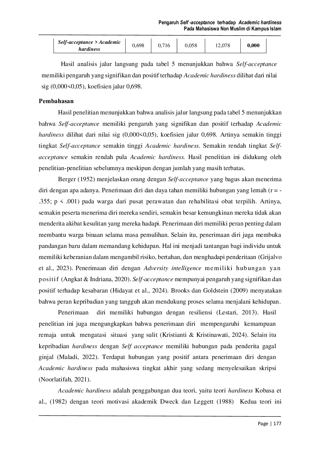 Penelitian ini menunjukkan bahwa self-acceptance memiliki pengaruh positif dan signifikan terhadap academic hardiness.Implikasi dari penelitian ini adalah bahwa mahasiswa non-muslim di kampus Islam perlu meningkatkan self-acceptance agar dapat mempertahankan academic hardiness di lingkungan kampus tersebut.Selanjutnya, penelitian ini menyarankan agar kampus Islam tetap menjalankan ajaran Islam dengan menanamkan nilai-nilai positif kepada seluruh sivitas akademika.