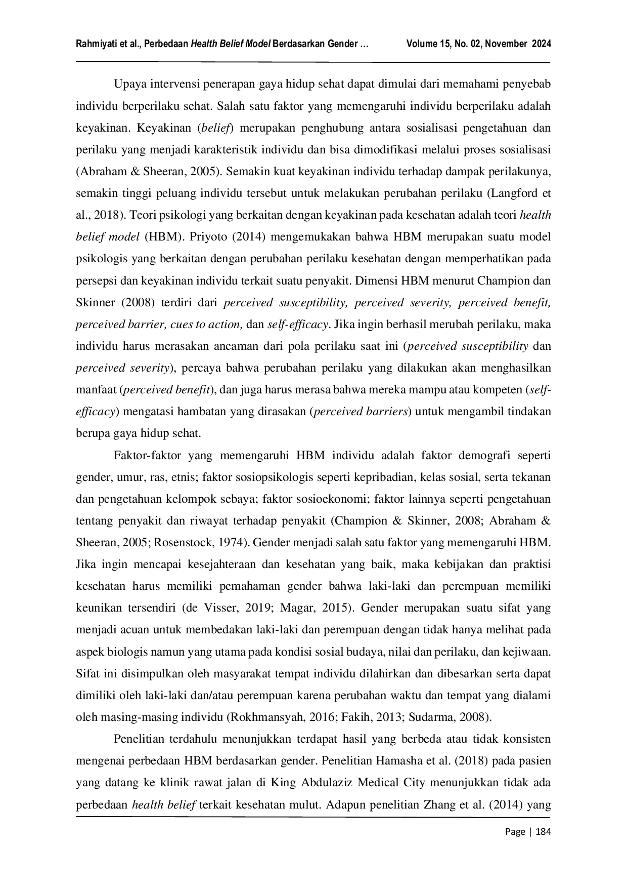 Penelitian menunjukkan tidak ada perbedaan HBM berdasarkan gender pada mahasiswa kedokteran.Kedua kelompok secara bersamaan memiliki HBM yang cukup baik.Meskipun demikian, terdapat selisih yang tidak signifikan pada kedua kelompok, dimana perempuan cenderung memiliki keyakinan dan berpotensi menerapkan perilaku sehat yang lebih besar dibandingkan laki-laki.