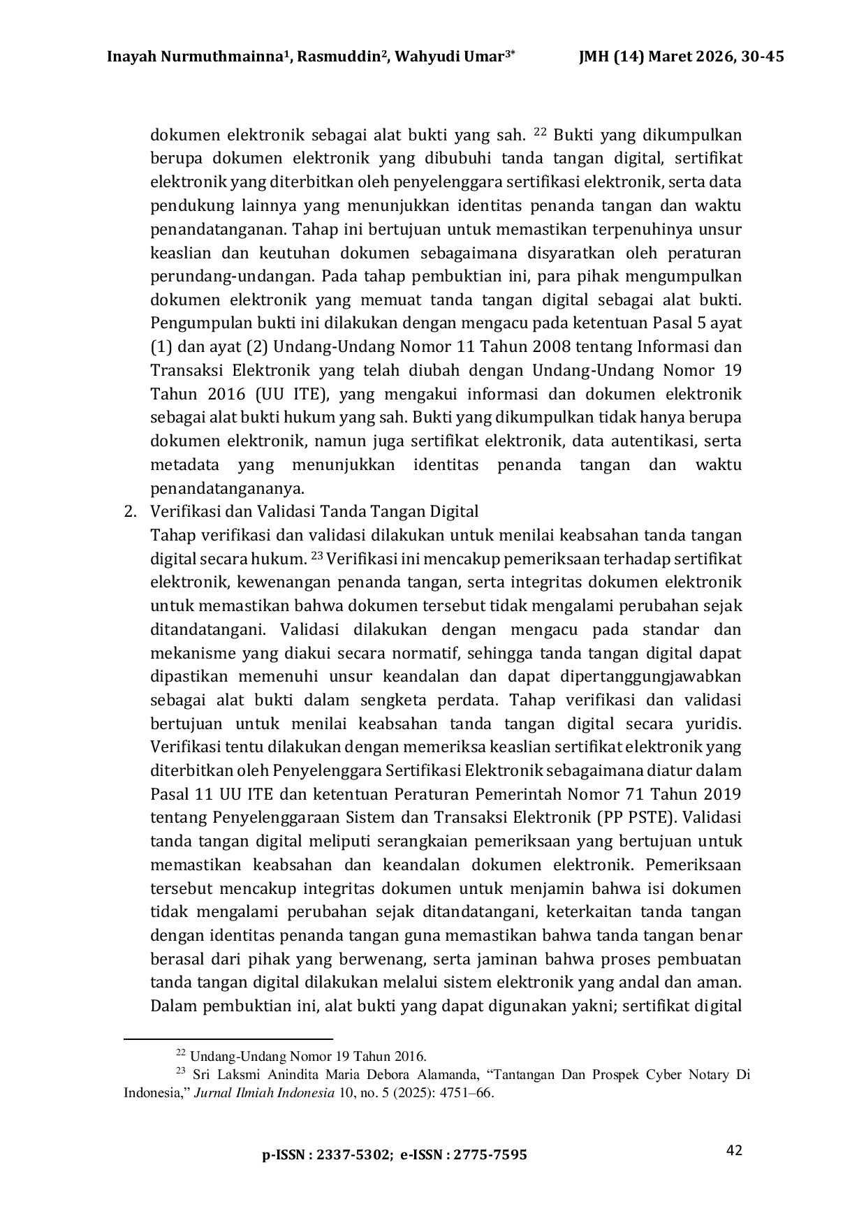 Jurnal Media HukumJurnal Media HukumPerkembangan teknologi digital telah mendorong perubahan signifikan dalam praktik pembuktian hukum perdata, khususnya terkait penggunaan tanda tangan digital dalam transaksi elektronik. Tanda tangan digital semakin banyak digunakan sebagai sarana autentikasi dan persetujuan dalam perjanjian elektronik, namun masih menimbulkan permasalahan hukum terkait kekuatan pembuktiannya dalam sengketa perdata. Penelitian ini bertujuan untuk mengkaji kekuatan pembuktian tanda tangan digital serta menganalisis pengaturan hukumnya dalam sistem hukum Indonesia. Metode penelitian yang digunakan adalah penelitian hukum normatif dengan pendekatan perundang-undangan dan pendekatan konseptual. Hasil penelitian menunjukkan bahwa tanda tangan digital memiliki kekuatan pembuktian yang sah dan mengikat sebagai alat bukti hukum sepanjang memenuhi unsur keotentikan sebagaimana diatur dalam Undang-Undang Informasi dan Transaksi Elektronik beserta peraturan pelaksananya. Meskipun demikian, dalam praktik peradilan perdata masih ditemukan kendala berupa keterbatasan pemahaman teknis aparat penegak hukum serta perbedaan penilaian hakim terhadap alat bukti elektronik. Oleh karena itu, diperlukan penguatan regulasi, peningkatan kapasitas sumber daya manusia di bidang hukum dan teknologi informasi, serta penyesuaian hukum acara perdata guna menjamin kepastian hukum dan perlindungan hukum para pihak dalam sengketa perdata di era digital.