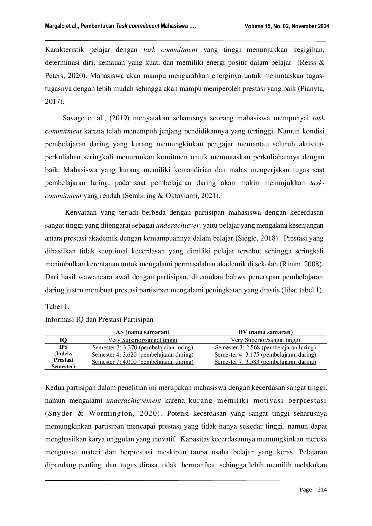 Faktor pembentuk task commitment dalam mengikuti pembelajaran daring terbagi menjadi faktor yang melemahkan dan menguatkan task commitment.aspirasi akademik orangtua yang rendah, kondisi emosi yang negatif, dan kurangnya keyakinan akan kemampuan untuk mencapai prestasi yang unggul.Kurangnya keyakinan akan kemampuan melemahkan usaha untuk menyelesaikan tugas dengan kualitas terbaiknya, walaupun sebenarnya dimiliki potensi yang unggul.Ketersediaan waktu luang yang berlebih karena tidak perlu berpindah tempat untuk kuliah disertai dengan rendahnya motivasi sebagai dampak dari tidak dimilikinya target atau tujuan khusus dalam belajar membuat mahasiswa underachiever berkecerdasan sangat tinggi kurang mengupayakan penyelesaian tugas secara bertahap.Mereka lebih melakukan penundaan penyelesaian tugas sampai detik terakhir pengumpulan tugas dengan mengalihkan kegiatan belajar menjadi kegiatan bersenang-senang dengan dalih untuk membangun motivasi.Adanya pandangan bahwa semua tugas dapat dikerjakan dengan cepat karena tidak mempedulikan kualitas hasil kinerjanya disertai dengan karakteristik tugas yang kurang memunculkan motivasi untuk menguasai dengan baik membuat underachiever berkecerdasan sangat tinggi meremehkan tugas dan menyelesaikannya ala kadarnya.suasana belajar yang membangun dorongan untuk belajar, fleksibilitas waktu belajar, resiliensi akademik, kondisi emosi yang positif, dukungan keluarga dan teman, pandangan tentang karakteristik tugas yang menantang dan minat terhadap tugas.Metode mengajar yang sesuai dengan kebutuhan belajar disertai dengan tugas yang menantang serta sesuai dengan minat mendorong mahasiswa untuk mengerjakan tugasnya secara bertahap, mendalami materi lebih baik dan memanfaatkan dalam penyelesaian tugas, mengupayakan kinerja yang baik untuk mencapai kualitas tugas yang baik.Fleksibilitas waktu belajar untuk mengerjakan tugas yang menantang disertai dengan resiliensi akademik membuat mahasiswa tetap bertekun menyelesaikan tugasnya.Kondisi emosi positif membangun energi positif untuk mengatasi kendala dalam menyelesaikan tugas, apalagi ditambah dengan adanya dukungan dari orangtua dan teman yang memberikan semangat serta membangun keyakinan bahwa tugas akan dapat diselesaikan dengan baik.