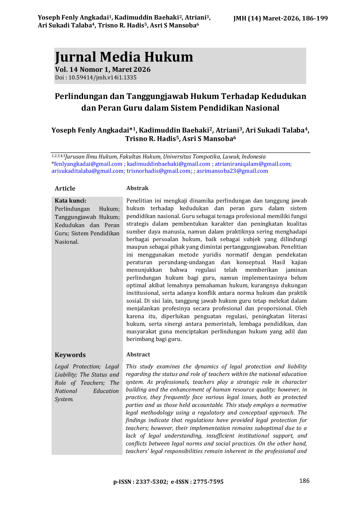 Jurnal Media HukumJurnal Media HukumPenelitian ini mengkaji dinamika perlindungan dan tanggung jawab hukum terhadap kedudukan dan peran guru dalam sistem pendidikan nasional. Guru sebagai tenaga profesional memiliki fungsi strategis dalam pembentukan karakter dan peningkatan kualitas sumber daya manusia, namun dalam praktiknya sering menghadapi berbagai persoalan hukum, baik sebagai subjek yang dilindungi maupun sebagai pihak yang dimintai pertanggungjawaban. Penelitian ini menggunakan metode yuridis normatif dengan pendekatan peraturan perundang-undangan dan konseptual. Hasil kajian menunjukkan bahwa regulasi telah memberikan jaminan perlindungan hukum bagi guru, namun implementasinya belum optimal akibat lemahnya pemahaman hukum, kurangnya dukungan institusional, serta adanya konflik antara norma hukum dan praktik sosial. Di sisi lain, tanggung jawab hukum guru tetap melekat dalam menjalankan profesinya secara profesional dan proporsional. Oleh karena itu, diperlukan penguatan regulasi, peningkatan literasi hukum, serta sinergi antara pemerintah, lembaga pendidikan, dan masyarakat guna menciptakan perlindungan hukum yang adil dan berimbang bagi guru.