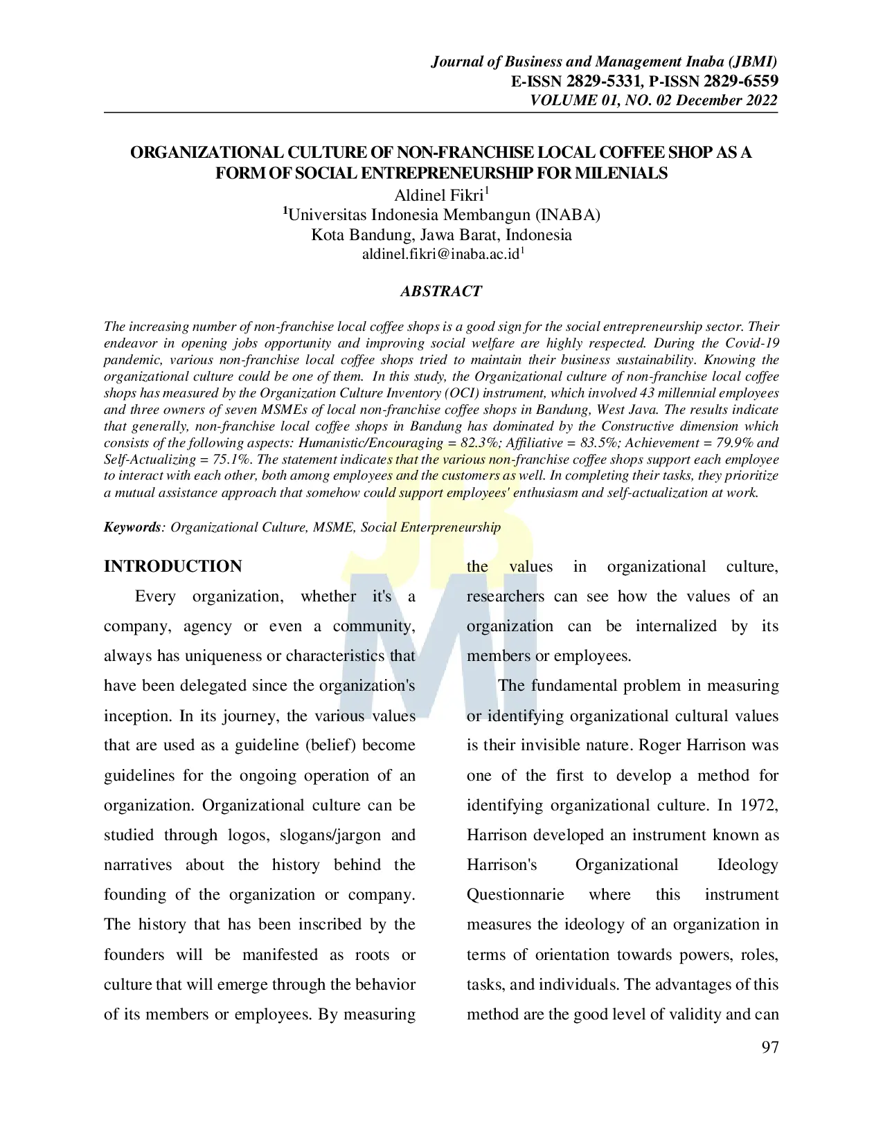Journal of Business and Management InabaJournal of Business and Management InabaMeningkatnya jumlah kedai kopi lokal non-franchise merupakan pertanda baik bagi sektor kewirausahaan sosial. Upaya mereka dalam membuka peluang kerja dan meningkatkan kesejahteraan sosial sangat dihargai. Selama pandemi Covid-19, berbagai kedai kopi lokal non-franchise berusaha mempertahankan keberlanjutan usahanya. Salah satunya dapat diketahui melalui budaya organisasi. Dalam penelitian ini, budaya organisasi kedai kopi lokal non-franchise diukur menggunakan instrumen Organization Culture Inventory (OCI), yang melibatkan 43 karyawan milenial dan tiga pemilik dari tujuh usaha mikro, kecil, dan menengah (UMKM) kedai kopi lokal non-franchise di Bandung, Jawa Barat. Hasil menunjukkan bahwa secara umum, kedai kopi lokal non-franchise di Bandung didominasi oleh dimensi Konstruktif yang terdiri atas aspek-aspek berikut: Humanistik/Mendorong = 82,3%; Afiliatif = 83,5%; Pencapaian = 79,9%; dan Aktualisasi Diri = 75,1%. Pernyataan ini menunjukkan bahwa berbagai kedai kopi non-franchise mendukung setiap karyawan untuk berinteraksi satu sama lain, baik antar karyawan maupun dengan pelanggan. Dalam menyelesaikan tugas, mereka mengutamakan pendekatan saling membantu yang dapat mendukung antusiasme dan aktualisasi diri karyawan di tempat kerja.