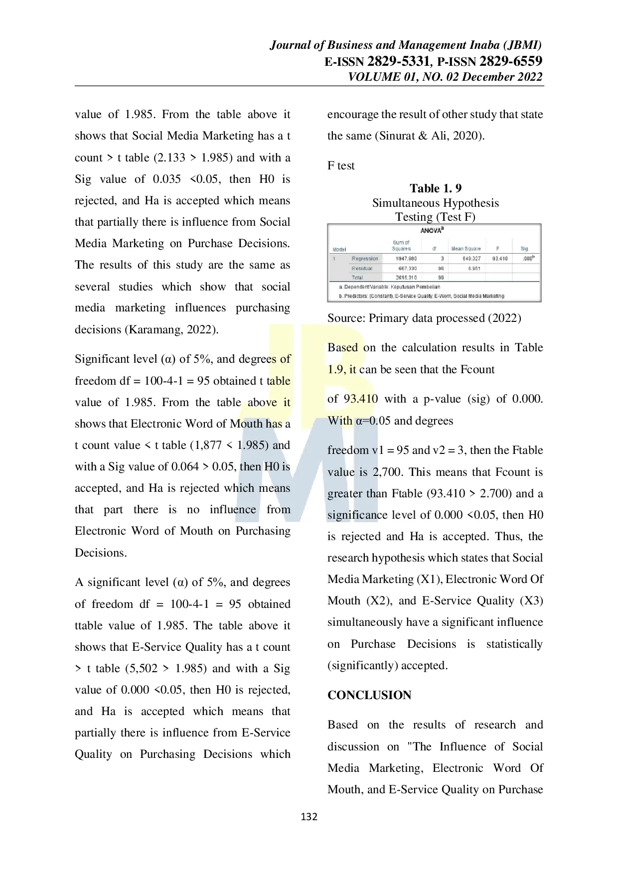Journal of Business and Management InabaJournal of Business and Management InabaBukalapak is one of the E-commerce companies in Indonesia. From the owner of a local shopping brand through its own group which was founded in 2010. Bukalapaks net income in the 2017-2021 period fluctuated and at the end of 2021, it decreased significantly. The purpose of this study was to determine the effect of Social Media Marketing, Electronic Word Of Mouth, and E-Service Quality on Purchase Decisions at the Bukalapak Marketplace in Bandung City. The research method used was quantitative methods with descriptive and verification approaches. The types of data used are primary and secondary data sources. The sampling technique used is purposive sampling with a sample size of 100 respondents. The descriptive results show that Purchase Decision, Social Media Marketing, Electronic Word Of Mouth, and E-Service Quality show the poor category. The results of the Coefficient of Determination Simultaneously the effect of Social Media Marketing, Electronic Word Of Mouth, and E-Service Quality on purchasing decisions is 74.5%, the remaining 25.5% is influenced by other factors and hypothesis testing shows that Social Media Marketing partially has a significant effect on decisions. Purchases with a Sig value of 0.035 < 0.05, Electronic Word Of Mouth partially has no significant effect on purchasing decisions with a Sig value of 0.064 > 0.05, and E-Service Quality partially has a significant effect on purchasing decisions. Social Media Marketing, Electronic Word Of Mouth, and E-Service Quality simultaneously have a significant effect on Purchase Decisions with a Sig value of 0.000 <0.05.