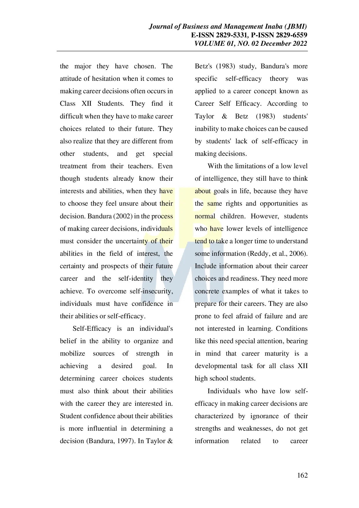 Journal of Business and Management InabaJournal of Business and Management InabaEvery student has their own potential, and those with special needs are not an exception. One of them is the slow learners. They need to have a chance to compete in the career world and reach career maturity. However, some students are uncertain about deciding on a career path that goes along with their ability and major. This study aims to test the effect of Career Self Efficacy training on career maturity improvement of 12th-grade slow learner students in SMK X Bandung. This study uses a population sampling technique in which subjects characteristics are defined by their IQ, low level of career maturity, and parents consent. From there, it is found that there are four slow learners majoring in culinary in 12th grade. In this study, a single-group pretest-posttest design is used to measure the change in career maturity after the Career Self-Efficacy training. Wilcoxon sign-rank shows a significant improvement after the subjects participated in the training. Based on the result, it is suggested that schools make Self Efficacy training a career counseling program for slow learner students.