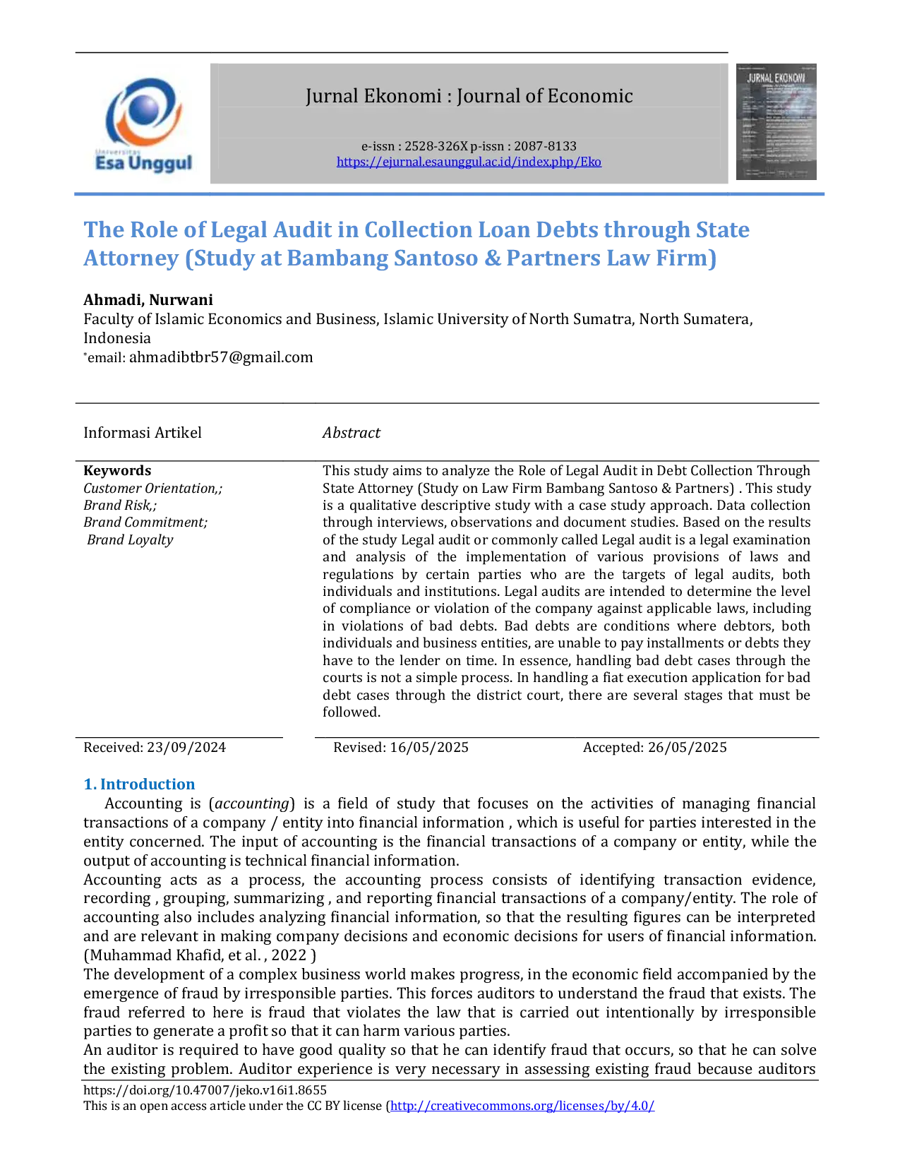 Jurnal Ekonomi : Journal of EconomicJurnal Ekonomi : Journal of EconomicPenelitian ini bertujuan untuk menganalisis Peran Audit Hukum dalam Penagihan Utang Melalui Jaksa Pengacara Negara (Studi pada Kantor Hukum Bambang Santoso & Partners). Penelitian ini merupakan studi deskriptif kualitatif dengan pendekatan studi kasus. Pengumpulan data dilakukan melalui wawancara, observasi, dan studi dokumen. Berdasarkan hasil penelitian, audit hukum atau yang umum disebut audit hukum adalah pemeriksaan dan analisis hukum terhadap penerapan berbagai ketentuan hukum dan peraturan oleh pihak-pihak tertentu yang menjadi target audit hukum, baik perorangan maupun institusi. Audit hukum bertujuan untuk menentukan tingkat kepatuhan atau pelanggaran perusahaan terhadap hukum yang berlaku, termasuk dalam pelanggaran utang buruk. Utang buruk adalah kondisi di mana debitur, baik perorangan maupun badan usaha, tidak mampu membayar angsuran atau utang yang mereka miliki kepada kreditur tepat waktu. Pada dasarnya, penanganan kasus utang buruk melalui pengadilan bukanlah proses yang sederhana. Dalam menangani permohonan eksekusi terpaksa untuk kasus utang buruk melalui pengadilan negeri, terdapat beberapa tahapan yang harus diikuti.
