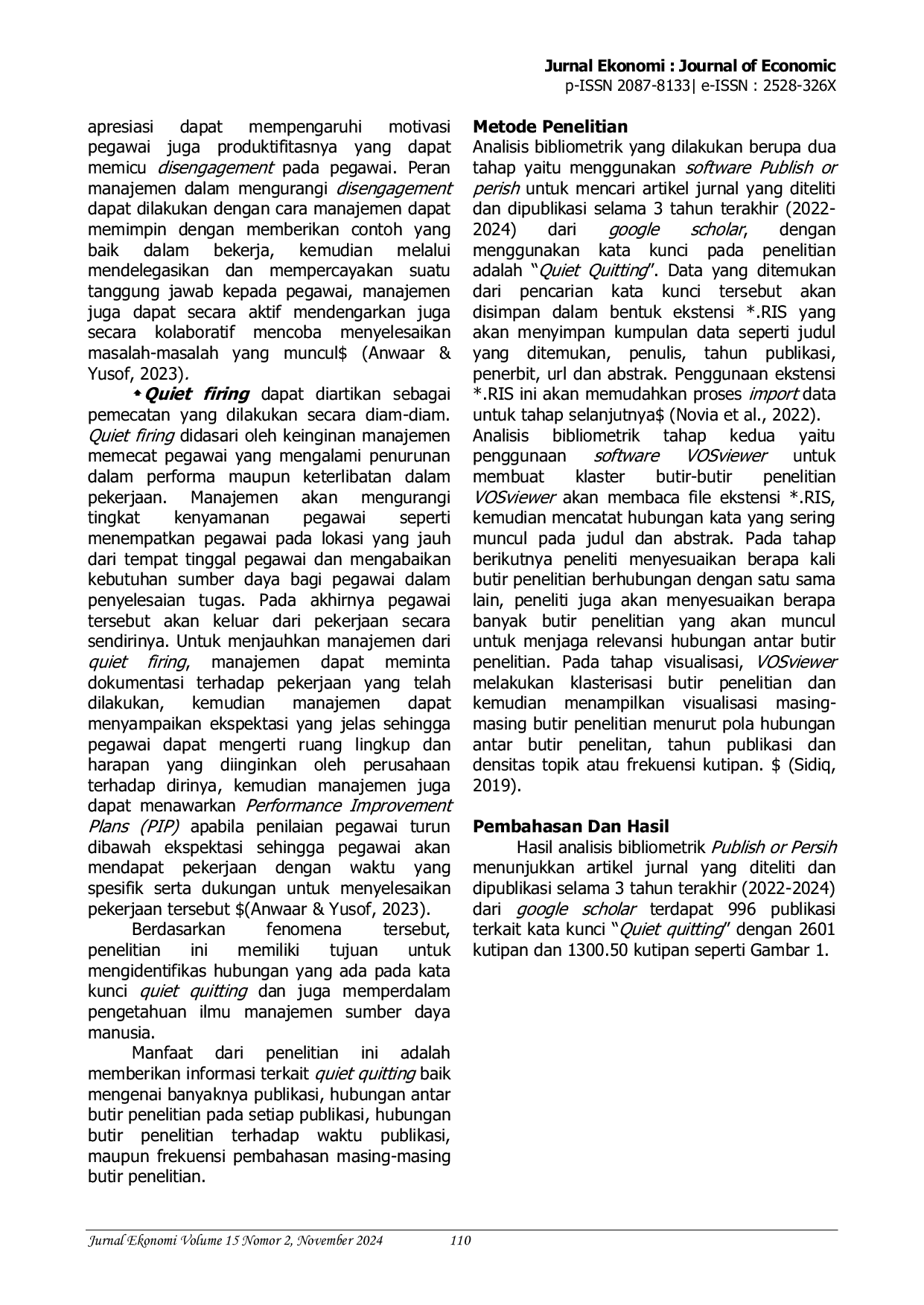 Jurnal Ekonomi : Journal of EconomicJurnal Ekonomi : Journal of EconomicKinerja dan keterlibatan pegawai dapat menurun setiap saat. Ketidakmampuan perusahaan untuk memberikan work-life balance dapat mengarah kepada quiet quitting yang apabila diabaikan akan dapat meningkatkan turnover pegawai. Tujuan penelitian ini adalah memberikan informasi terkait hubungan yang ada pada quiet quitting berdasarkan penelitian sebelumnya. Metode yang dilakukan dalam penelitian analisis bibliometrik ini adalah menggabungkan software publish or perish dalam mencari penelitian terdahulu dengan kata kunci “quiet quitting dan penggunaan software VOSviewer dalam mengklaster dan memvisualisasikan butir-butir penelitian tersebut. Hasil yang ditemukan pada penelitian ini adalah pada rentang waktu 2022-2024 terdapat 996 penelitian terkait quiet quitting, VOSviewer mengklaster butir-butir tersebut menjadi 5 (lima) klaster dan memvisualisasikan hubungan antar butir, tahun publikasi dan densitas topik atau frekuensi penelitian. Hasil visualisasi menunjukkan bahwa butir-butir ini memiliki hubungan antar klaster, butir penelitian quiet firing dan disengagement memiliki hubungannya sendiri, butir berikutnya adalah the great resignation, management, work-life balance dan job burnout masing-masing memiliki hubungan dengan job satisfaction. Penelitian ini juga menemukan bahwa job burnout dan job satisfaction merupakan butir penelitian yang memiliki densitas relatif kecil karena lebih sering diteliti pada tahun 2024. Sehingga berdasarkan hasil penelitian ini dapat disimpulkan bahwa hubungan butir penelitian quiet firing dan disengagement patut mendapatkan perhatian terkait hubungannya dengan quiet quitting serta job burnout dan job satisfaction merupakan butir penelitian yang jarang diteliti hubungannya dengan quiet quitting.
