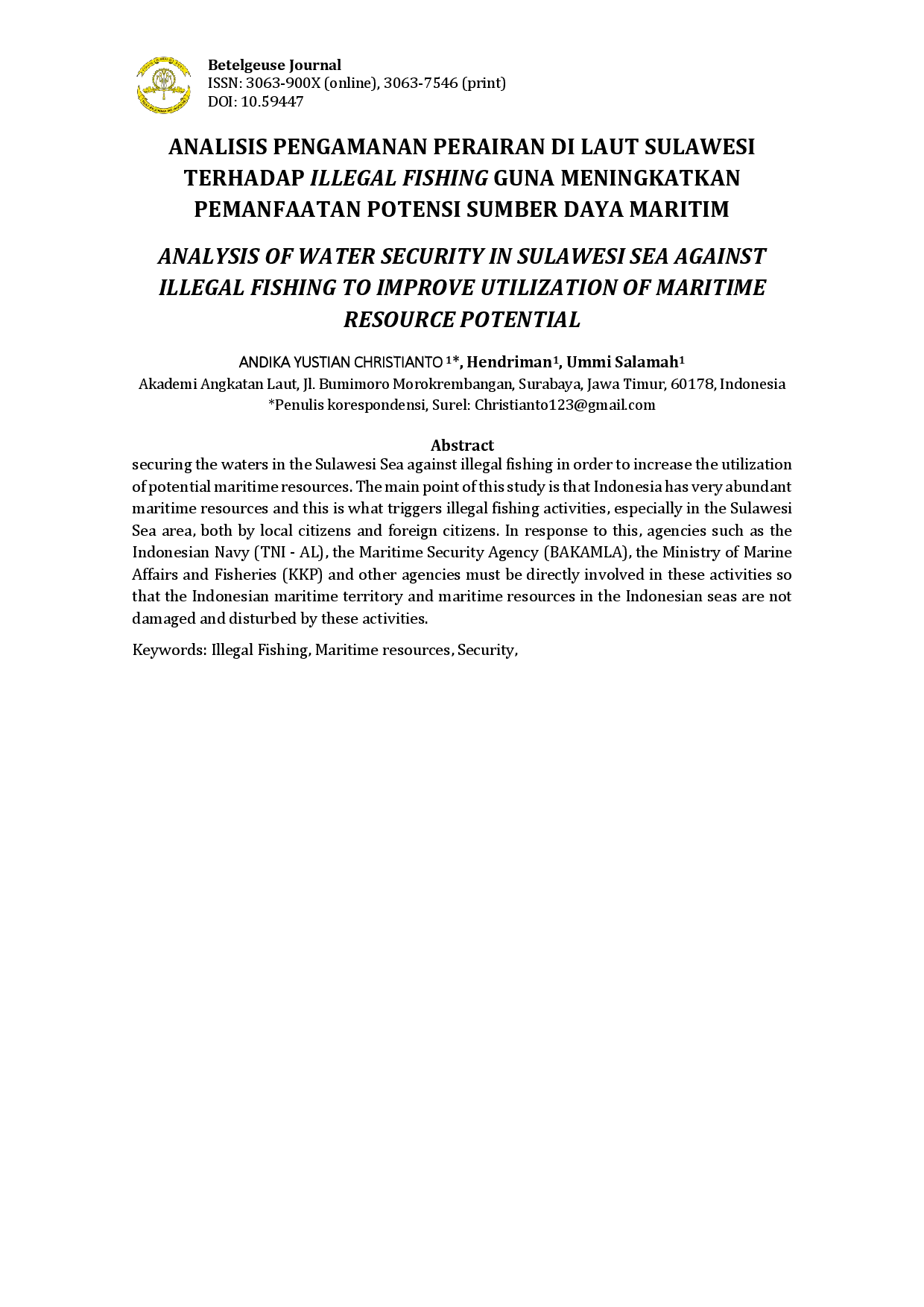 Betelgeuse JournalBetelgeuse JournalPengamanan perairan di Laut Sulawesi terhadap illegal fishing guna meningkatkan pemanfaatan potensi sumber daya maritim. Pokok dari penelitian ini adalah bahwa Indonesia memiliki sumber daya maritim yang sangat melimpah dan hal ini yang memicu terjadinya kegiatan illegal fishing, khususnya di wilayah Laut Sulawesi, baik yang dilakukan warga negara lokal maupun warga negara asing. Menyikapi hal tersebut, instansi seperti Tentara Nasional Indonesia Angkatan Laut (TNI – AL), Badan Keamanan Laut (BAKAMLA), KKP (Kementerian Kelautan dan Perikanan) serta instansi lainnya harus terjun langsung dalam kegiatan tersebut agar wilayah kelautan Indonesia serta sumber daya maritim yang ada di lautan Indonesia tidak rusak dan terganggu akan adanya kegiatan tersebut.