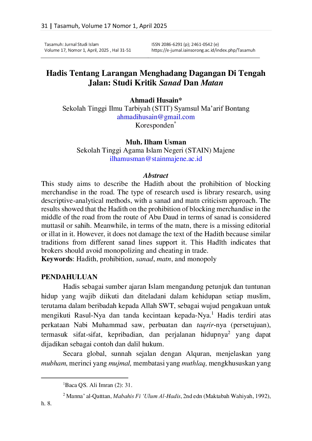 Tasamuh: Jurnal Studi IslamTasamuh: Jurnal Studi IslamThis study aims to describe the Hadith about the prohibition of blocking merchandise in the road. The type of research used is library research, using descriptive-analytical methods, with a sanad and matn criticism approach. The results showed that the Hadith on the prohibition of blocking merchandise in the middle of the road from the route of Abu Daud in terms of sanad is considered muttasil or sahih. Meanwhile, in terms of the matn, there is a missing editorial or illat in it. However, it does not damage the text of the Hadith because similar traditions from different sanad lines support it. This Hadīth indicates that brokers should avoid monopolizing and cheating in trade.