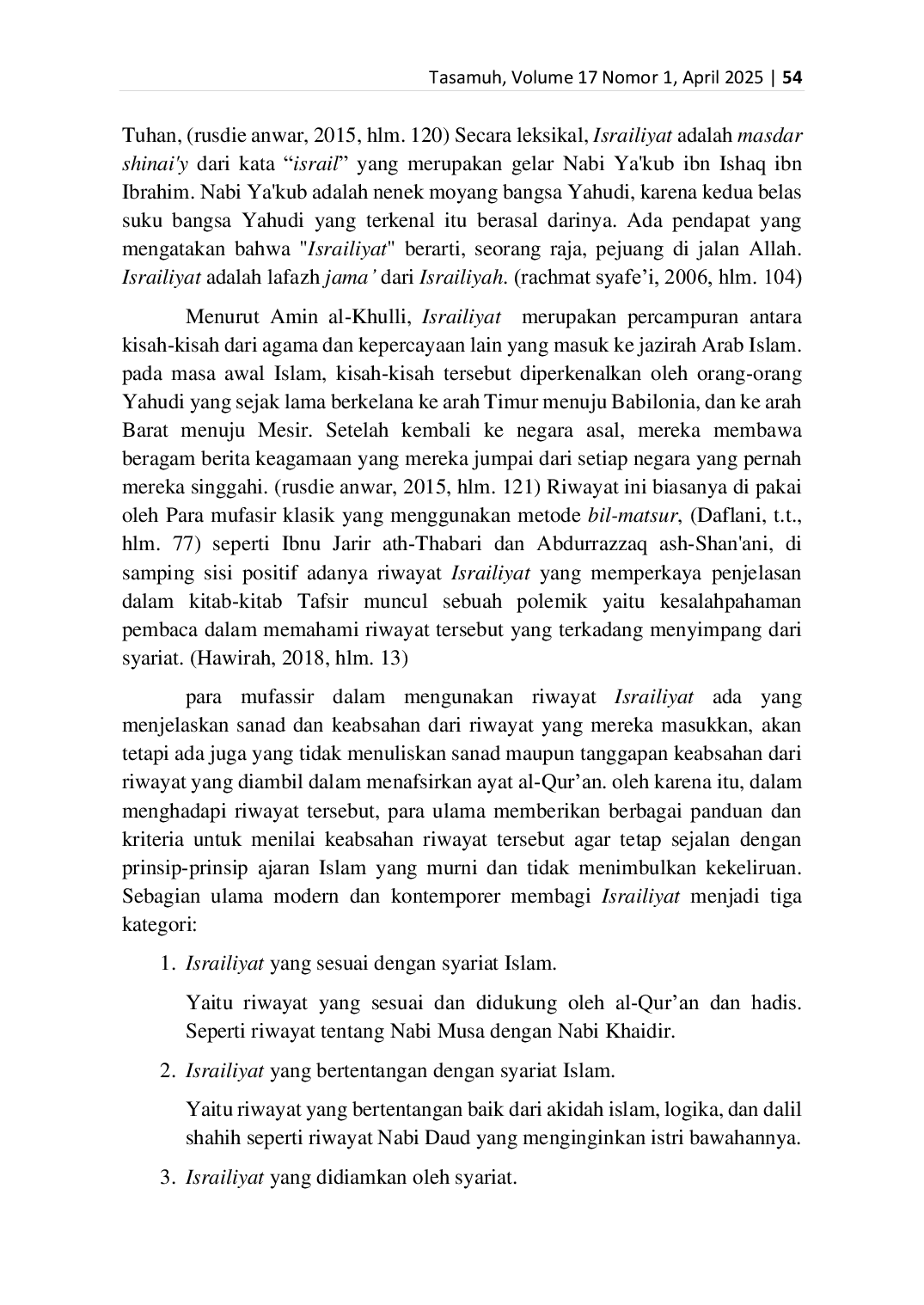 Tasamuh: Jurnal Studi IslamTasamuh: Jurnal Studi IslamPenelitian ini menganalisis riwayat Israiliyat tentang kisah Nabi Daud dalam QS. Shad (38:21-25) yang menceritakan pertemuannya dengan dua individu yang berselisih. Studi ini berfokus pada bagaimana Ibnu Jarir ath-Thabari dan Abdurrazzaq ash-Shanani menggunakan Israiliyat dalam interpretasi mereka dan memeriksa sumber serta validitas riwayat-riwayat tersebut. Menggunakan metode kualitatif deskriptif dengan pendekatan studi pustaka, penelitian ini mengandalkan Tafsir ath-Thabari, Tafsir Abdurrazzaq ash-Shanani, dan sumber-sumber relevan lainnya. Hasil penelitian mengungkapkan perbedaan dalam sanad dan struktur interpretatif, namun kedua Tafsir tersebut memiliki sumber awal yang sama dari al-Hasan. Riwayat tersebut menggambarkan ayat tersebut sebagai ujian bagi Nabi Daud dan teguran, yang menyebutkan bahwa ia berniat menikahi istri bawahannya. Untuk mengevaluasi keaslian riwayat-riwayat ini, penelitian ini merujuk pada perspektif para cendekiawan Tafsir klasik dan kontemporer.