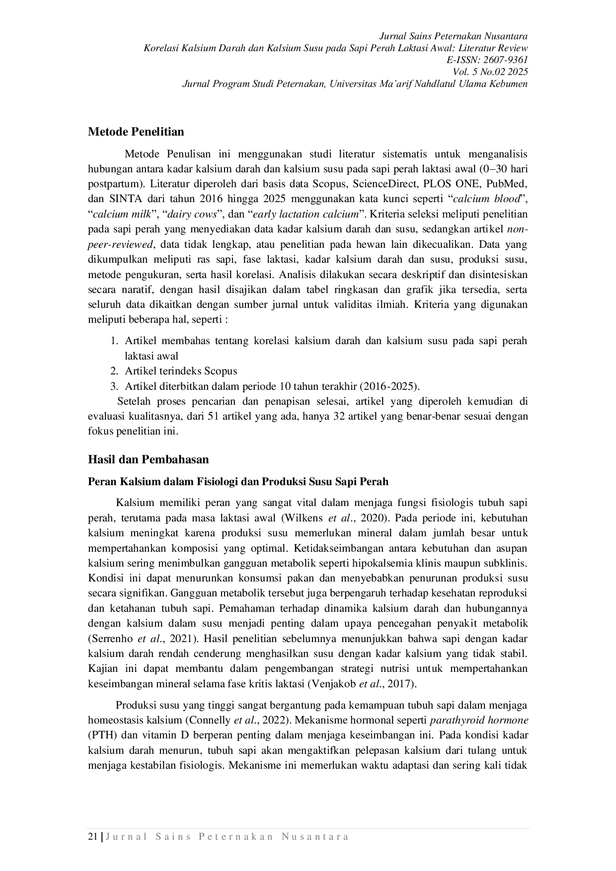 Jurnal Sains Peternakan NusantaraJurnal Sains Peternakan NusantaraKalsium memegang peran penting dalam menjaga fungsi fisiologis sapi perah pada awal laktasi ketika kebutuhan mineral meningkat tajam untuk pembentukan kolostrum dan produksi susu. Ketidakseimbangan kalsium pada fase ini sering menyebabkan hipokalsemia yang berdampak pada kesehatan dan performa produksi. Kajian literatur menunjukkan bahwa kadar kalsium darah memiliki hubungan yang erat dengan kadar kalsium susu, dimana perubahan konsentrasi kalsium darah cenderung diikuti oleh perubahan kalsium yang diekskresikan ke dalam susu. Penelitian sebelumnya melaporkan nilai korelasi yang tinggi, yaitu 0,905, yang menggambarkan hubungan positif yang kuat antara kedua parameter tersebut. Mekanisme fisiologis seperti regulasi hormon PTH, vitamin D, dan mobilisasi tulang berperan besar dalam menjaga keseimbangan kalsium tubuh selama masa laktasi awal. Pemantauan kalsium darah dan susu dapat dijadikan indikator penting untuk menilai status metabolik sapi perah dan membantu menentukan strategi suplementasi mineral yang tepat pada periode transisi.