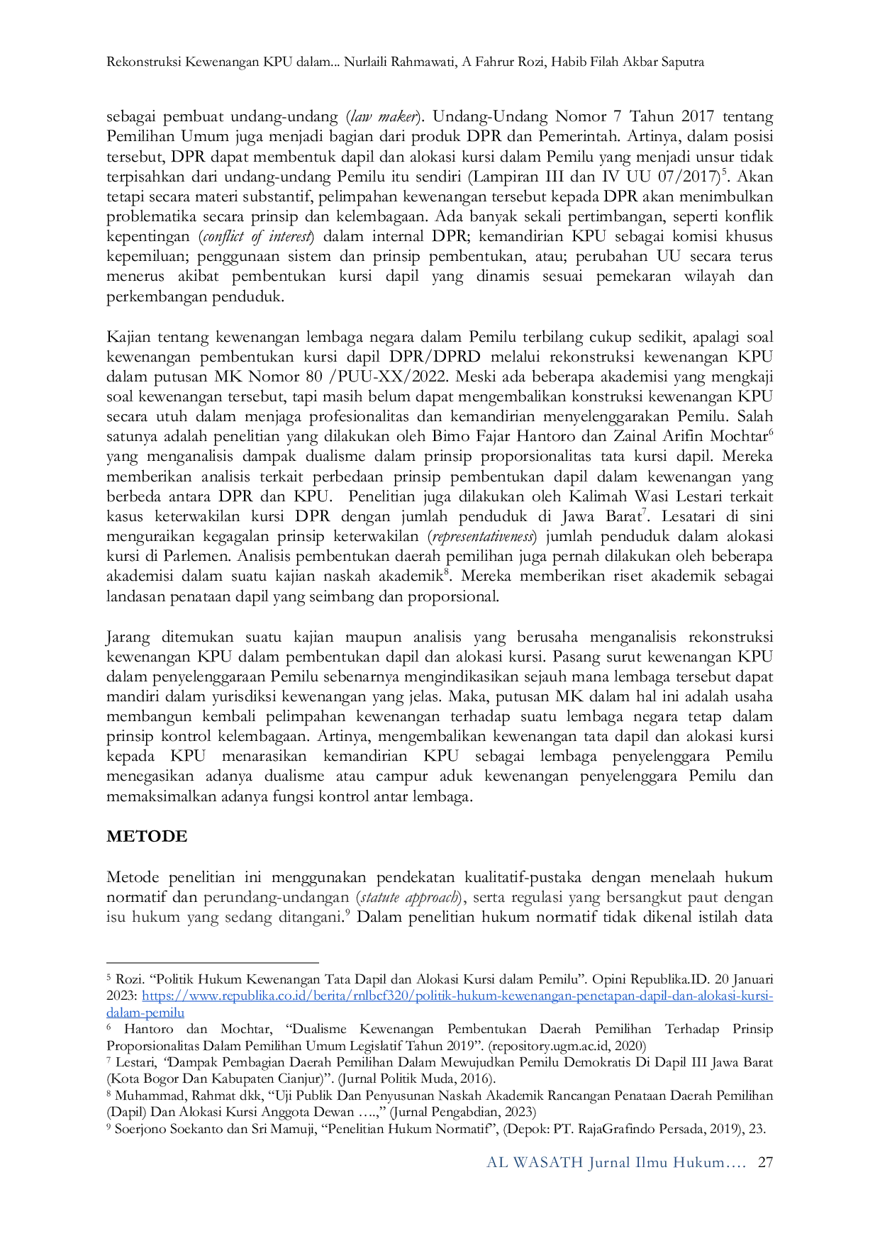 AL WASATH Jurnal Ilmu HukumAL WASATH Jurnal Ilmu HukumKewenangan Komisi Pemilihan Umum (KPU) untuk menentukan daerah pemilihan dan alokasi kursi dalam pemilu mengalami pasang surut. Putusan Mahkamah Konstitusi No. 80/PUU-XX/2022 mengembalikan kewenangan tata dapil dan alokasi kursi kepada KPU secara mutlak melalui Peraturan Komisi Pemilihan Umum (PKPU). Penelitian ini bertujuan menelaah ulang kewenangan lembaga negara dalam pembentukan dapil dan alokasi kursi Pemilu melalui ruang lingkup pemberian kewenangan dan prinsip kontrol kelembagaan (check and balances). Metode penelitian ini menggunakan pendekatan kualitatif-pustaka dengan menelaah hukum normatif dan perundang-undangan (statute approach), serta regulasi yang berkaitan. Hasil penelitian ini menunjukkan bahwa penataan daerah pemilihan dan alokasi kursi menjadi bagian dalam kewenangan KPU sebagai Penyelenggara Pemilu berdasarkan konsep administrasi kewenangan dan prinsip kelembagaan negara.