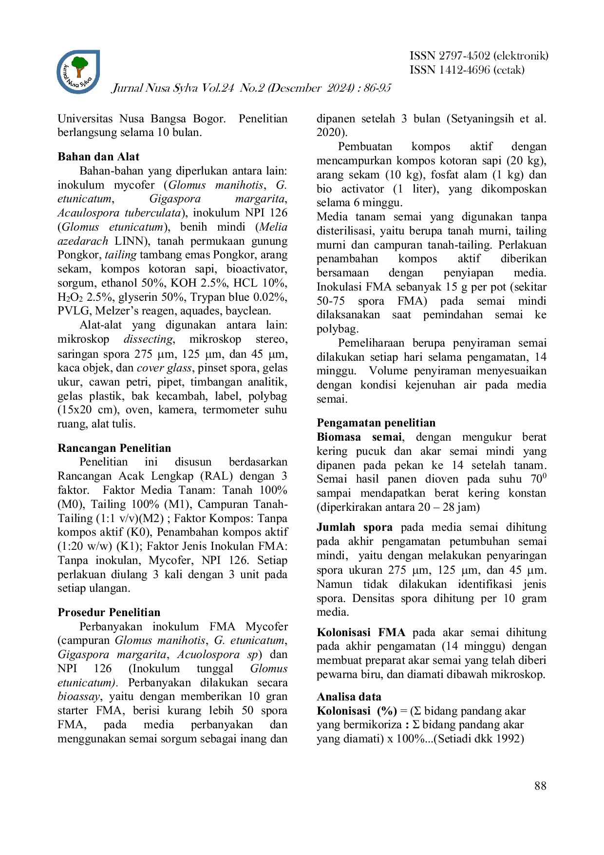 Aplikasi kompos aktif pada media tailing mampu meningkatkan kolonisasi inokulan FMA NPI 126 (Glomus etunicatum) hingga 300–819% serta meningkatkan jumlah spora dan kolonisasi FMA lokal hingga 10 kali lipat dibandingkan media tanpa kompos.Ketergantungan semai mindi terhadap FMA sangat tinggi pada media tanpa kompos, sebagaimana ditunjukkan oleh nilai Mycorrhiza Inoculation Effect (MIE) yang lebih tinggi dibandingkan media dengan aplikasi kompos aktif.Hal ini mengonfirmasi bahwa cendawan mikoriza berperan penting dalam mendukung pertumbuhan tanaman, terutama pada media tanam miskin hara seperti tailing.