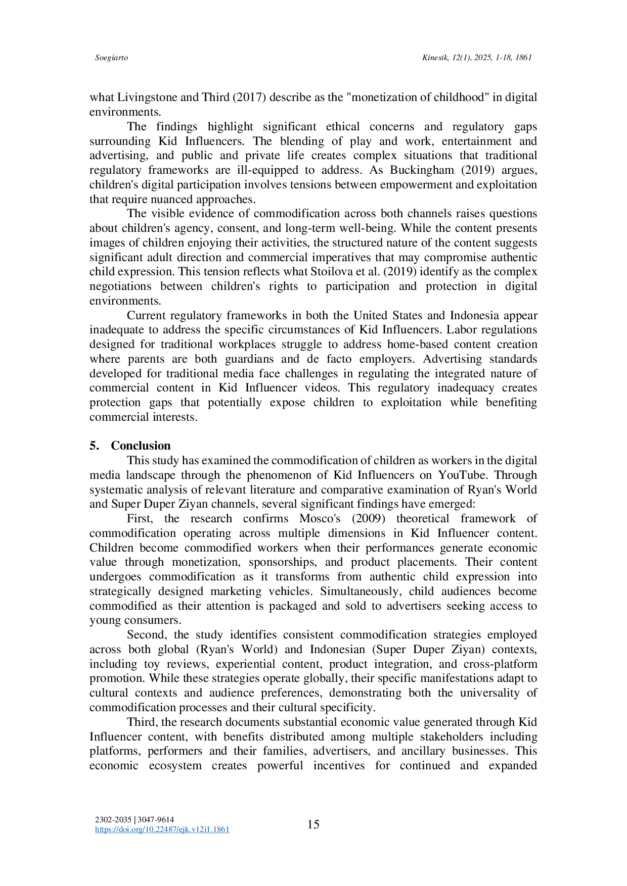Penelitian ini telah mengkonfirmasi kerangka teoritis Mosco (2009) tentang komodifikasi yang beroperasi di berbagai dimensi dalam konten Kid Influencer.Anak-anak menjadi pekerja yang dikomodifikasi ketika penampilan mereka menghasilkan nilai ekonomi melalui monetisasi, sponsorship, dan penempatan produk.Konten mereka mengalami komodifikasi saat berubah dari ekspresi anak yang autentik menjadi kendaraan pemasaran yang dirancang secara strategis.Secara bersamaan, penonton anak menjadi dikomodifikasi saat perhatian mereka dikemas dan dijual kepada pengiklan yang mencari akses ke konsumen muda.Studi ini juga mengidentifikasi strategi komodifikasi yang konsisten yang digunakan di kedua konteks global (Ryans World) dan Indonesia (Super Duper Ziyan), termasuk ulasan mainan, konten pengalaman, integrasi produk, dan promosi lintas platform.Meskipun strategi ini beroperasi secara global, manifestasinya yang spesifik menyesuaikan diri dengan konteks budaya dan preferensi penonton, menunjukkan universalitas proses komodifikasi dan spesifikitas budaya mereka.Penelitian ini mendokumentasikan nilai ekonomi yang signifikan yang dihasilkan melalui konten Kid Influencer, dengan manfaat didistribusikan di antara berbagai pemangku kepentingan termasuk platform, performer dan keluarga mereka, pengiklan, dan bisnis pendukung.Ekosistem ekonomi ini menciptakan insentif yang kuat untuk praktik komodifikasi berkelanjutan dan diperluas, sementara kepentingan anak sebagai performer dan penonton mungkin terkompromi.Studi ini juga menyoroti kesenjangan regulasi yang signifikan di kedua konteks Amerika Serikat dan Indonesia, di mana perlindungan tenaga kerja anak tradisional dan regulasi media belum berkembang secara memadai untuk mengatasi situasi unik anak-anak yang menciptakan konten digital.Kesenjangan regulasi ini menciptakan kerentanan perlindungan yang mungkin mengekspos anak-anak terhadap eksploitasi sambil menguntungkan kepentingan komersial.