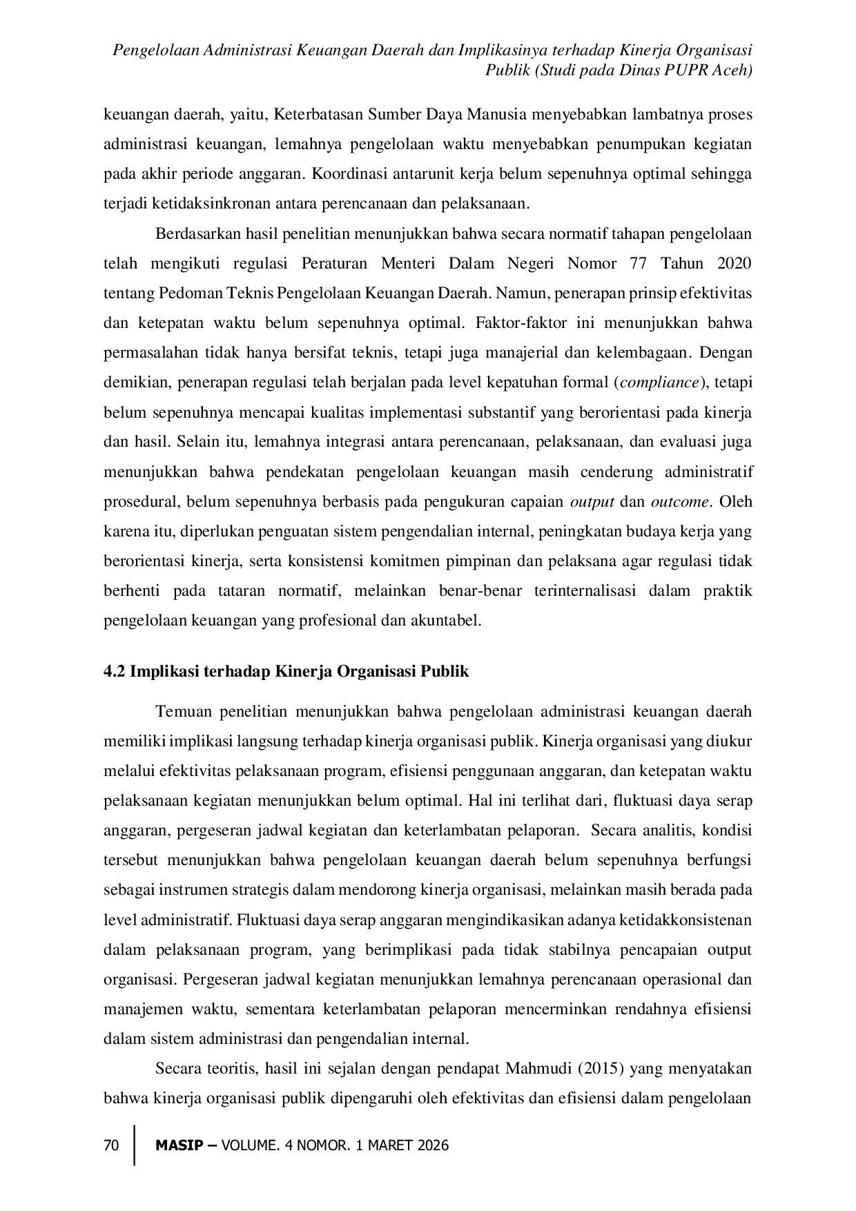 Masip: Jurnal Manajemen Administrasi Bisnis dan Publik TerapanMasip: Jurnal Manajemen Administrasi Bisnis dan Publik TerapanPengelolaan administrasi keuangan daerah merupakan aspek strategis dalam mewujudkan tata kelola pemerintahan yang baik serta mendukung peningkatan kinerja organisasi publik. Namun, dalam praktiknya masih terdapat kesenjangan antara kepatuhan administratif dan efektivitas implementasi pengelolaan keuangan. Penelitian ini bertujuan untuk menganalisis pengelolaan administrasi keuangan daerah serta mengkaji implikasinya terhadap kinerja organisasi publik pada Dinas Pekerjaan Umum dan Penataan Ruang (PUPR) Provinsi Aceh. Penelitian ini menggunakan pendekatan kualitatif dengan jenis deskriptif. Hasil penelitian menunjukkan bahwa secara normatif pengelolaan administrasi keuangan telah dilaksanakan sesuai regulasi, namun secara substantif belum sepenuhnya optimal. Hal ini ditandai oleh adanya fluktuasi daya serap anggaran, khususnya pada belanja langsung, keterlambatan pelaporan, serta pergeseran jadwal pelaksanaan kegiatan. Faktor utama yang memengaruhi kondisi tersebut meliputi keterbatasan sumber daya manusia, lemahnya manajemen waktu, dan belum optimalnya koordinasi antarunit kerja. Implikasi dari kondisi ini terlihat pada belum optimalnya efektivitas program, efisiensi anggaran, serta ketepatan waktu pencapaian target organisasi. Penelitian ini menegaskan bahwa pengelolaan keuangan daerah tidak hanya berorientasi pada kepatuhan administratif, tetapi perlu diarahkan pada pendekatan berbasis kinerja untuk meningkatkan kualitas pelayanan publik dan pencapaian tujuan organisasi.
