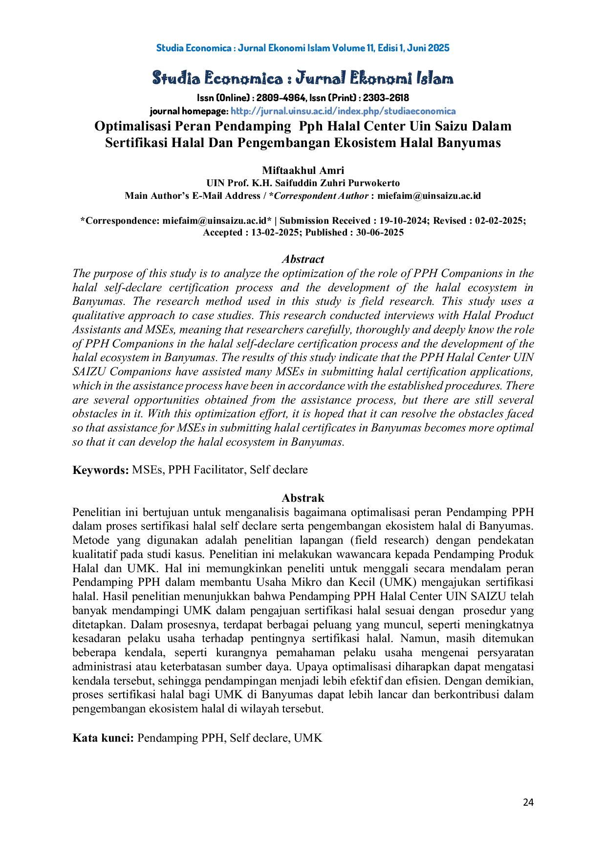 Studia Economica : Jurnal Ekonomi IslamStudia Economica : Jurnal Ekonomi IslamPenelitian ini bertujuan untuk menganalisis bagaimana optimalisasi peran Pendamping PPH dalam proses sertifikasi halal self declare serta pengembangan ekosistem halal di Banyumas. Metode yang digunakan adalah penelitian lapangan (field research) dengan pendekatan kualitatif pada studi kasus. Penelitian ini melakukan wawancara kepada Pendamping Produk Halal dan UMK. Hal ini memungkinkan peneliti untuk menggali secara mendalam peran Pendamping PPH dalam membantu Usaha Mikro dan Kecil (UMK) mengajukan sertifikasi halal. Hasil penelitian menunjukkan bahwa Pendamping PPH Halal Center UIN SAIZU telah banyak mendampingi UMK dalam pengajuan sertifikasi halal sesuai dengan prosedur yang ditetapkan. Dalam prosesnya, terdapat berbagai peluang yang muncul, seperti meningkatnya kesadaran pelaku usaha terhadap pentingnya sertifikasi halal. Namun, masih ditemukan beberapa kendala, seperti kurangnya pemahaman pelaku usaha mengenai persyaratan administrasi atau keterbatasan sumber daya. Upaya optimalisasi diharapkan dapat mengatasi kendala tersebut, sehingga pendampingan menjadi lebih efektif dan efisien. Dengan demikian, proses sertifikasi halal bagi UMK di Banyumas dapat lebih lancar dan berkontribusi dalam pengembangan ekosistem halal di wilayah tersebut.