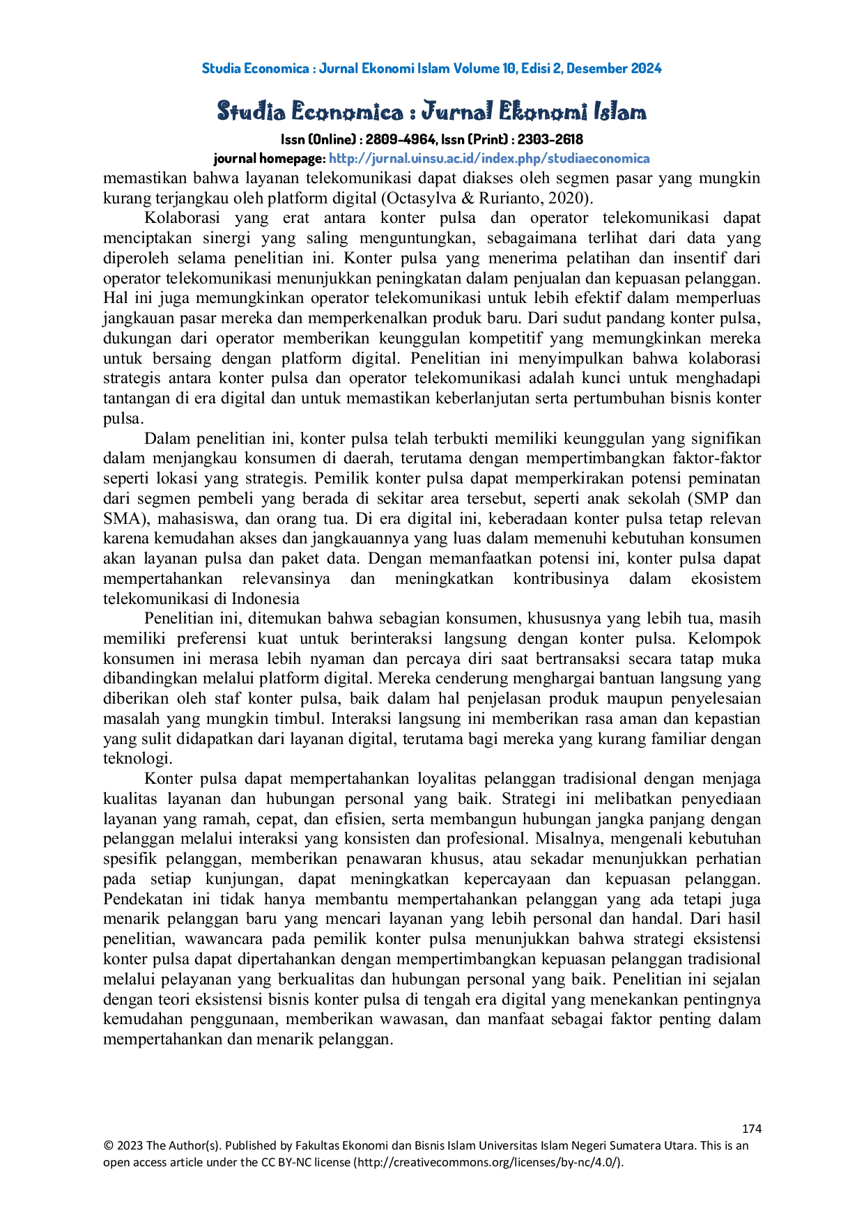 Studia Economica : Jurnal Ekonomi IslamStudia Economica : Jurnal Ekonomi IslamPenelitian ini bertujuan untuk mengkaji . Fokus penelitian mencakup strategi bisnis efektif, peluang pasar, dan tantangan yang dihadapi. Metode kualitatif deskriptif digunakan dengan wawancara mendalam, observasi partisipatif, dan analisis dokumen pada Konter Pulsa Indra di Pontianak. Hasil penelitian ini menunjukkan pentingnya diversifikasi layanan dan pemanfaatan teknologi digital untuk meningkatkan efisiensi operasional dan daya saing. Tantangan utama termasuk persaingan dengan platform digital dan penurunan penjualan pulsa. Penelitian ini mengidentifikasi bahwa kolaborasi dengan operator telekomunikasi dan peningkatan layanan pelanggan merupakan strategi kunci untuk mempertahankan relevansi bisnis konter pulsa. Penelitian ini memberikan wawasan penting tentang adaptasi bisnis tradisional di era digital, menunjukkan bahwa meskipun teknologi mengubah lanskap pasar, konter pulsa tetap relevan melalui inovasi layanan dan komunikasi yang efektif dengan pelanggan. Temuan ini diharapkan dapat menjadi referensi bagi pelaku usaha dalam merancang strategi yang adaptif terhadap perkembangan teknologi dan kebutuhan konsumen.