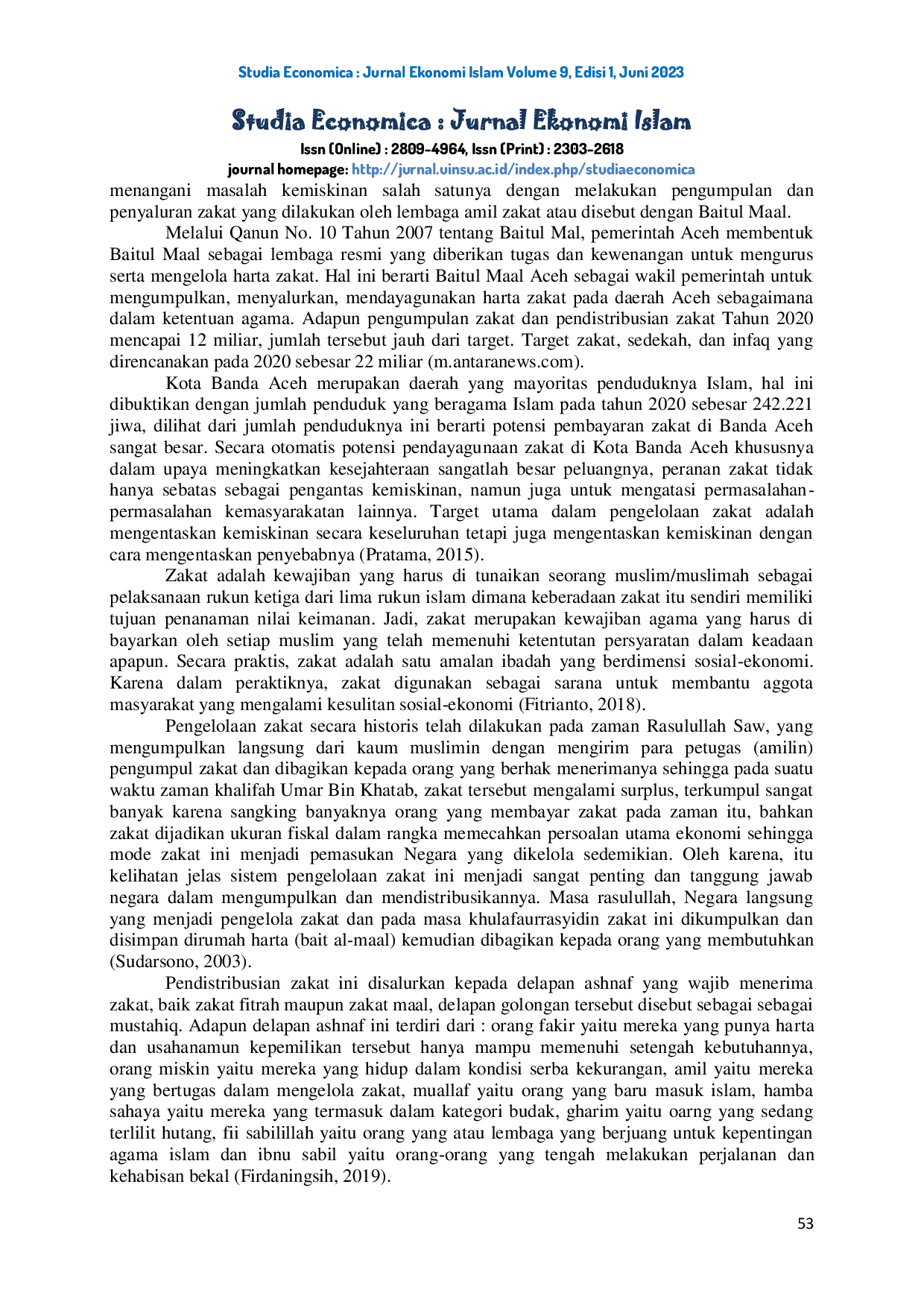 Studia Economica : Jurnal Ekonomi IslamStudia Economica : Jurnal Ekonomi IslamKota Banda Aceh merupakan daerah yang mayoritas penduduknya Islam, hal ini dibuktikan dengan jumlah penduduk yang beragama Islam pada tahun 2020 sebesar 242.221 jiwa, dilihat dari jumlah penduduknya ini berarti potensi pembayaran zakat di Banda Aceh sangat besar. Secara otomatis potensi pendayagunaan zakat di Kota Banda Aceh khususnya dalam upaya meningkatkan kesejahteraan sangatlah besar peluangnya, peranan zakat tidak hanya sebatas sebagai pengantas kemiskinan, namun juga untuk mengatasi permasalahan-permasalahan kemasyarakatan lainnya. Penelitian ini bertujuan untuk mengetahui pengaruh zakat produktif terhadap laba usaha mustahiq pada Baitul Maal Kota Banda Aceh. Penelitian ini menggunakan pendekatan kuantitatif dengan jenis penelitian kolerasi. Populasi seluruh mustahiq sebanyak 280 dan sampel 74 orang. Teknik pengumpulan data kuesioner. Analisa data menggunakan SPSS Versi 26. Berdasarkan hasil penelitian diketahui bahwa variabel zakat produktif berpengaruh sangat kuat terhadap laba usaha mustahiq pada Baitul Maal Kota Banda Aceh, dimana nilai korelasi diperoleh sebesar 0,811 tergolong dalam kategori sangat kuat, serta diperkuat hasil uji t menunjukkan nilai thitung = 11,761 > ttabel = 1,666 artinya zakat produktif berpengaruh terhadap laba usaha mustahiq pada Baitul Maal Kota Banda Aceh, sebesar 65,8%.