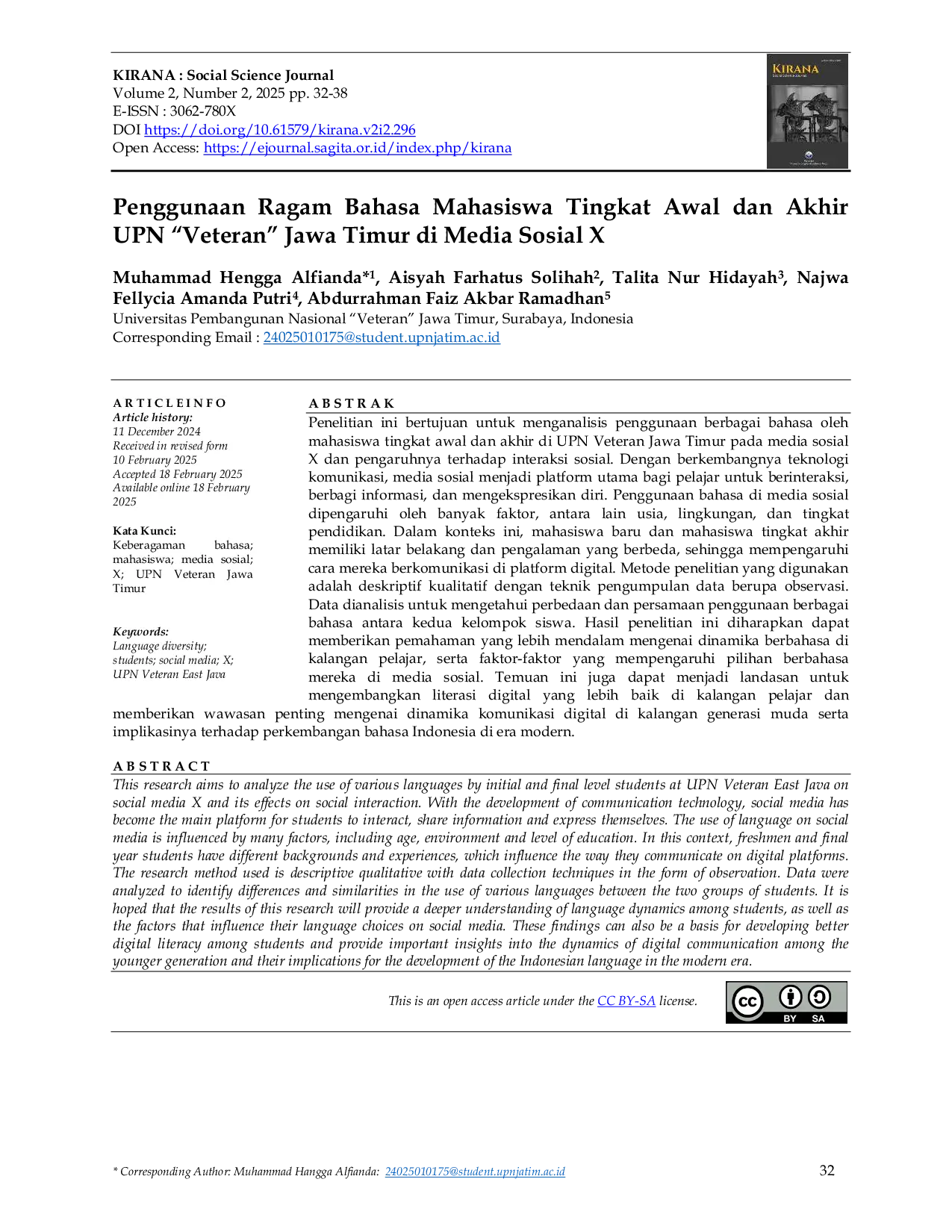 KIRANA : Social Science JournalKIRANA : Social Science JournalPenelitian ini bertujuan untuk menganalisis penggunaan berbagai bahasa oleh mahasiswa tingkat awal dan akhir di UPN Veteran Jawa Timur pada media sosial X dan pengaruhnya terhadap interaksi sosial. Dengan berkembangnya teknologi komunikasi, media sosial menjadi platform utama bagi pelajar untuk berinteraksi, berbagi informasi, dan mengekspresikan diri. Penggunaan bahasa di media sosial dipengaruhi oleh banyak faktor, antara lain usia, lingkungan, dan tingkat pendidikan. Dalam konteks ini, mahasiswa baru dan mahasiswa tingkat akhir memiliki latar belakang dan pengalaman yang berbeda, sehingga mempengaruhi cara mereka berkomunikasi di platform digital. Metode penelitian yang digunakan adalah deskriptif kualitatif dengan teknik pengumpulan data berupa observasi. Data dianalisis untuk mengetahui perbedaan dan persamaan penggunaan berbagai bahasa antara kedua kelompok siswa. Hasil penelitian ini diharapkan dapat memberikan pemahaman yang lebih mendalam mengenai dinamika berbahasa di kalangan pelajar, serta faktor-faktor yang mempengaruhi pilihan berbahasa juga dapat menjadi landasan untuk mengembangkan literasi digital yang lebih baik di kalangan pelajar dan memberikan wawasan penting mengenai dinamika komunikasi digital di kalangan generasi muda serta implikasinya terhadap perkembangan bahasa Indonesia di era modern.