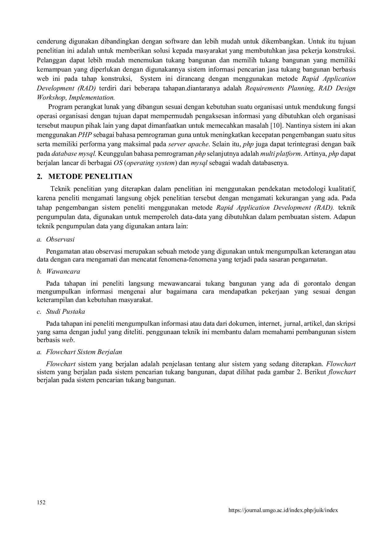 Jurnal Ilmu Komputer (JUIK)Jurnal Ilmu Komputer (JUIK)Penelitian ini bertujuan merancang Berbasis Web dan megimplementasikan Berbasis Web. Penelitian ini dikembangkan menggunakan metode Rapid Application Development (RAD). Dalam RAD, pengguna dan analis berpartisipasi dalam tiga tahap. Tiga tahapan tersebut adalah implementasi (implementation), perancangan RAD (RAD design), dan perencanaan kebutuhan (requirment planing). Dengan tahapan-tahapan tersebut penerapan metode RAD sangat tepat dan sesuai dalam pembangunan sistem berbasis website. Hasil penelitian ini peneliti telah melakukan wawancara sebelumnya kepada salah satu kepala tukang bangunan. Pihak tukang dalam provesinya sebagai tukang bangunan untuk mendapatkan pekerjaan yang sesuai dengan keahlian, hanya orang orang tertentu saja yang mengenal dan mengetahui kinerja tukang, keahlian tukang dibidang apa, sehingganya apabila ada pekerjaan khusus yang harus dikerjakan oleh tukang yang sesuai dengan keahliannya. Maka pemberi kerja harus bertemu langsung dengan tukang dan menanyakan keahlian tukang. simpulanTelah berhasil merancang berbasis web, mampu mempermudah customer (pemberi kerja) dalam melakukan pencarian jasa tukang bangunan sesuai keahlian yang dibutuhkan customer (pemberi kerja), serta untuk mempermudah tukang bangunan untuk mendapatkan pekerjaan yang sesuai dengan keahlian tukang. Dengan adanya sistem informasi ini dapat membantu tukang bangunan dan customer (pemberi kerja) dalam proses kegiatan pencarian tukang bangunan sesuai keahlian dalam bentuk Web ataupun web browser lainya.
