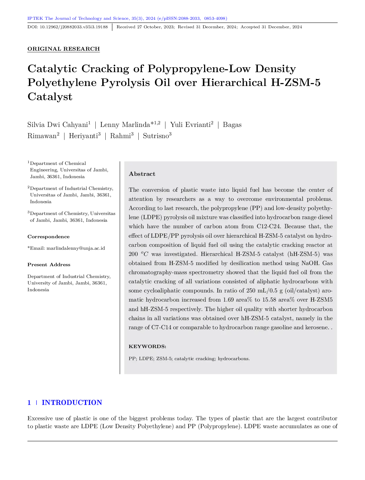 IPTEK The Journal for Technology and ScienceIPTEK The Journal for Technology and ScienceThe conversion of plastic waste into liquid fuel has become the center of attention by researchers as a way to overcome environmental problems. According to recent research, the polypropylene (PP) and low-density polyethylene (LDPE) pyrolysis oil mixture is classified into hydrocarbon range diesel with carbon numbers ranging from C12-C24. Therefore, the effect of LDPE/PP pyrolysis oil over hierarchical H-ZSM-5 catalyst on hydrocarbon composition of liquid fuel oil using a catalytic cracking reactor at 200 °C was investigated. Hierarchical H-ZSM-5 catalyst (hH-ZSM-5) was obtained from H-ZSM-5 modified by desilication using NaOH. Gas chromatography-mass spectrometry showed that the liquid fuel oil from the catalytic cracking of all variations consisted of aliphatic hydrocarbons with some cycloaliphatic compounds. An increase in aromatic hydrocarbon content from 1.69 area% to 15.58 area% was observed over H-ZSM-5 and hH-ZSM-5, respectively, at a ratio of 250 mL/0.5 g (oil/catalyst). Higher oil quality with shorter hydrocarbon chains, comparable to hydrocarbon range gasoline and kerosene (C7-C14), was obtained over the hH-ZSM-5 catalyst.