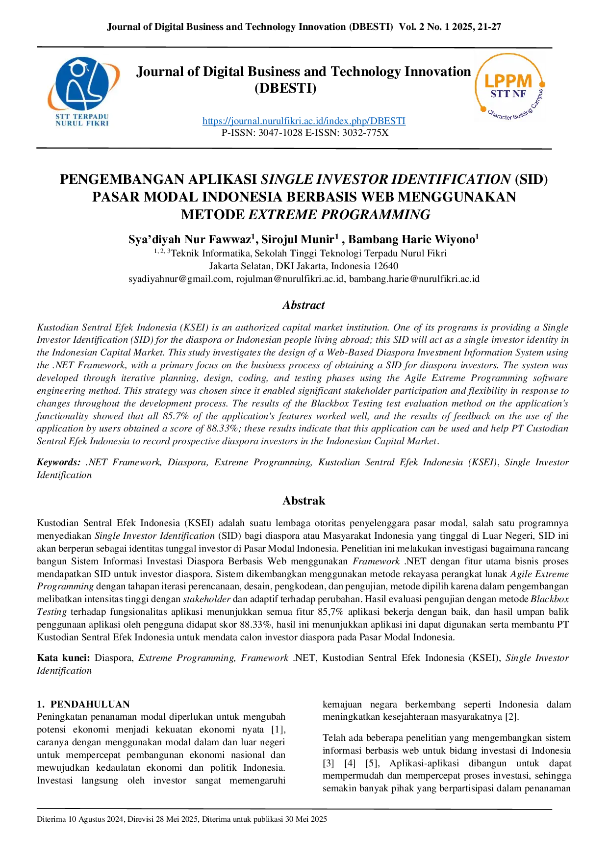DBESTI: Journal of Digital Business and Technology InnovationDBESTI: Journal of Digital Business and Technology InnovationKustodian Sentral Efek Indonesia (KSEI) merupakan lembaga penyelenggara pasar modal yang memiliki program penyediaan Single Investor Identification (SID) bagi diaspora atau Masyarakat Indonesia yang tinggal di Luar Negeri. SID ini berperan sebagai identitas tunggal investor di Pasar Modal Indonesia. Penelitian ini menginvestigasi rancang bangun Sistem Informasi Investasi Diaspora Berbasis Web menggunakan Framework .NET dengan fitur utama bisnis proses mendapatkan SID untuk investor diaspora. Sistem dikembangkan menggunakan metode rekayasa perangkat lunak Agile Extreme Programming dengan tahapan iterasi perencanaan, desain, pengkodean, dan pengujian. Hasil evaluasi pengujian dengan metode Blackbox Testing terhadap fungsionalitas aplikasi menunjukkan semua fitur 85,7% aplikasi bekerja dengan baik, dan hasil umpan balik penggunaan aplikasi oleh pengguna didapat skor 88.33%, hasil ini menunjukkan aplikasi ini dapat digunakan serta membantu PT Kustodian Sentral Efek Indonesia untuk mendata calon investor diaspora pada Pasar Modal Indonesia.