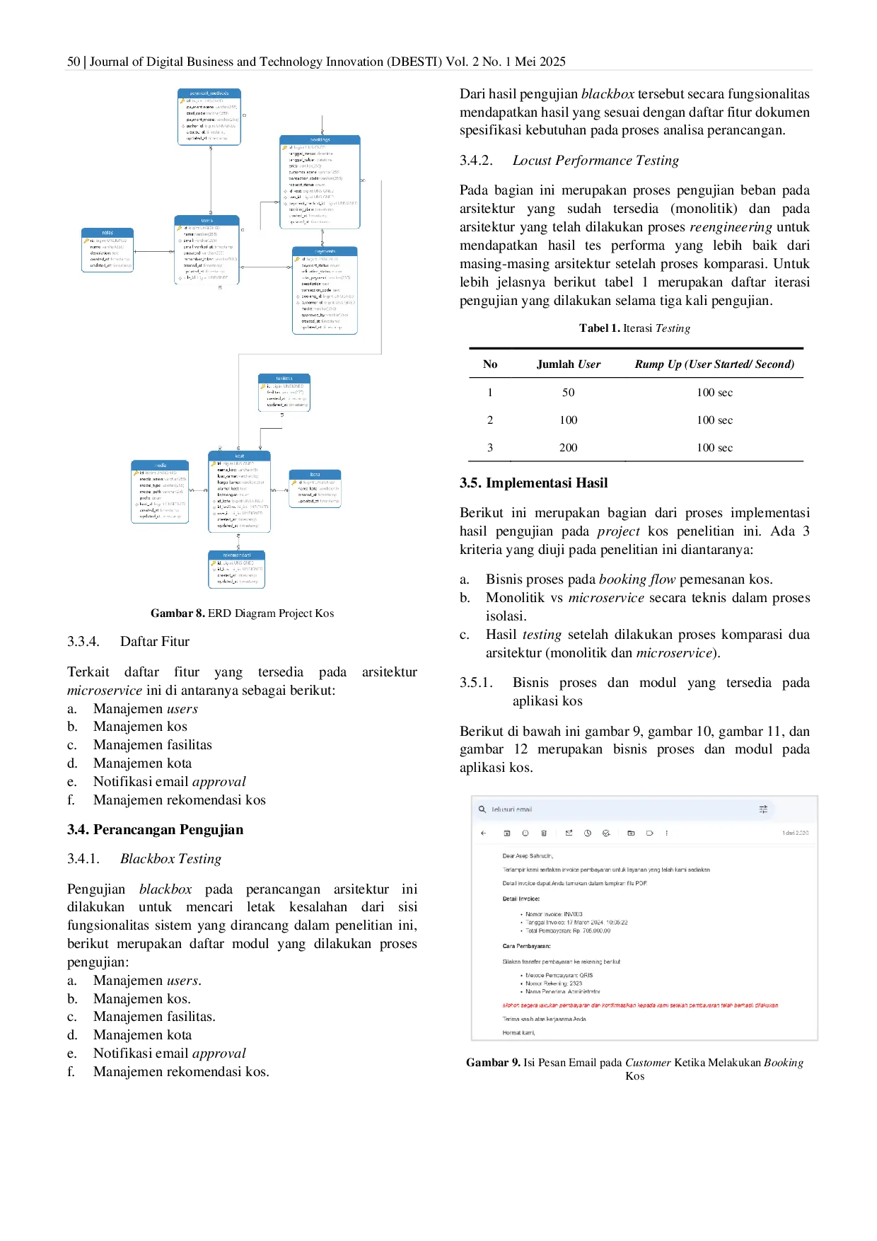 DBESTI: Journal of Digital Business and Technology InnovationDBESTI: Journal of Digital Business and Technology InnovationPertumbuhan penduduk di Jakarta yang semakin meningkat turut membuat permintaan akan kebutuhan tempat tinggal, termasuk kos-kosan menjadi melonjak. Lonjakan permintaan tersebut menjadi tantangan tersendiri dalam pengelolaan aplikasi dan situs web penyedia informasi dan layanan terkait kos-kosan dalam mengelola aktivitas user di dalam sistem. Oleh karenanya, peneliti mencoba untuk melakukan reengineering aplikasi kos yang telah ada dengan menggunakan model microservice. Penelitian ini membahas reengineering aplikasi kos backend dari model monolitik ke microservice dengan studi kasus pada Kos Jenggot. Metode pengembangan yang diterapkan dalam penelitian ini adalah Extreme Programming (XP) dengan metode pengujian yakni menggunakan blackbox testing dan performance testing. Hasil penelitian ini menunjukkan lebih unggul menggunakan model microservice dibandingkan model monolitik, dengan hasil blackbox testing sebesar 100% fitur dapat berjalan baik melalui performa untuk scenario paling besar yakni beban akses 200 user dalam waktu 100 detik yang memiliki total eror 100% untuk model monolitik dan 40% untuk model microservice. Dari hasil tersebut diperoleh, bahwa efektifitas penggunaan model microservice pada reengineering aplikasi kos ini lebih unggul dibandingkan model monolitik.