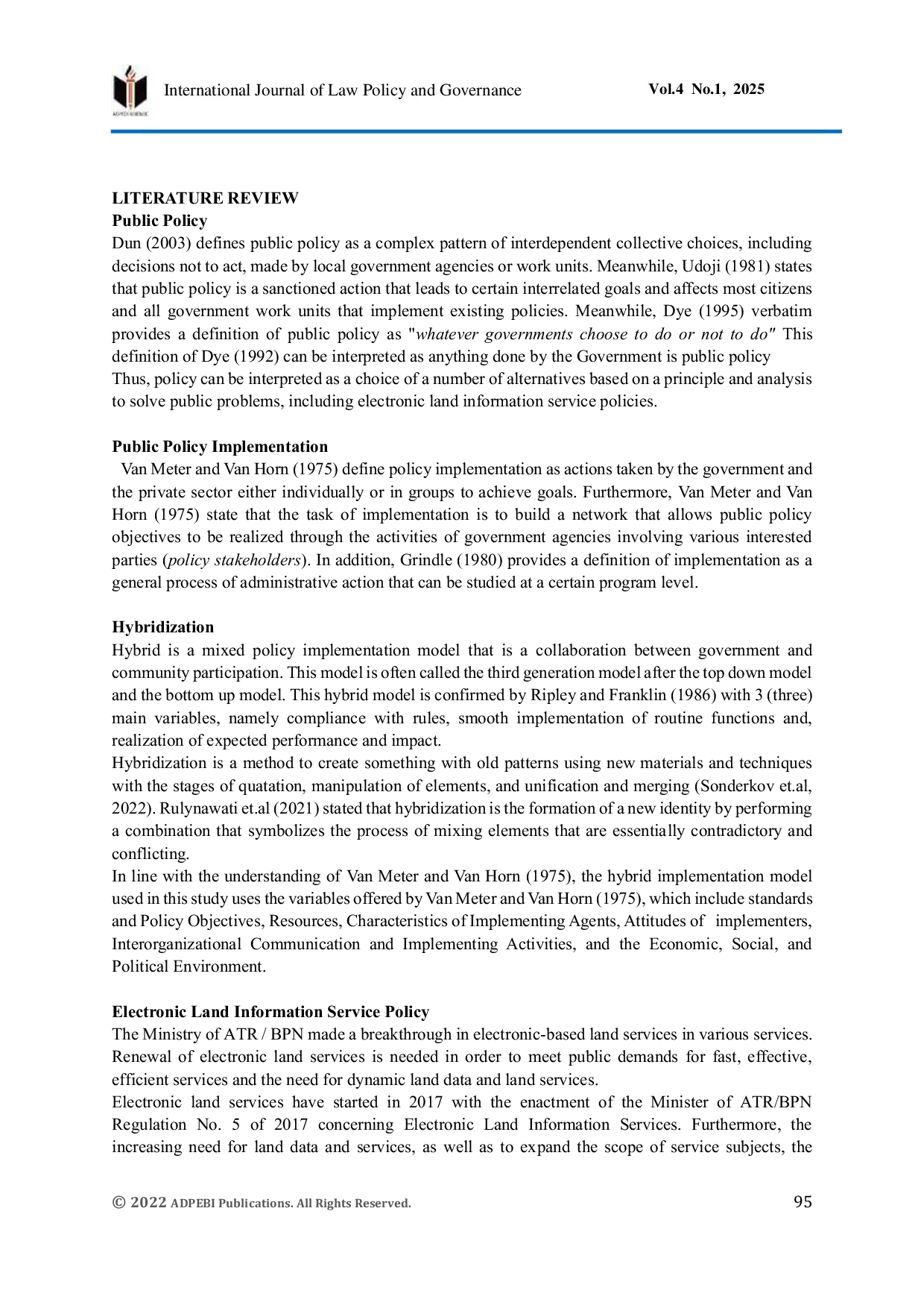 International Journal of Law Policy and GovernanceInternational Journal of Law Policy and GovernancePenelitian ini merupakan penelitian eksploratori kualitatif dengan observasi (vershtehen) yang bertujuan untuk mengeksplorasi dan menganalisis hibridisasi implementasi kebijakan Peraturan Menteri Agraria dan Tata Ruang/Kepala Badan Pertanahan Nasional Republik Indonesia Nomor 19 Tahun 2020 tentang layanan informasi pertanahan elektronik di Kota Bengkulu, Provinsi Bengkulu. Pengumpulan data dilakukan dengan observasi, dokumentasi, dan wawancara mendalam (indept interviews). Variabel yang diteliti dikembangkan dari Van Meter dan Van Horn (1975) yaitu sumber daya, komunikasi dan kegiatan antar-organisasi, karakteristik agen implementor, kondisi lingkungan, ekonomi, sosial, dan politik, sikap implementor. Penelitian ini menemukan bahwa peraturan layanan informasi pertanahan elektronik belum mengatur hal-hal teknis sehingga implementasinya memerlukan interpretasi. Karyawan dan agen implementor seperti PPAT, Surveyor membutuhkan bimbingan teknis sehingga target implementasi kebijakan tercapai. Selain itu, terdapat sumber daya manusia terampil yang terbatas dan infrastruktur jaringan internet menjadi faktor utama dalam proses hibridisasi administrasi pertanahan kebijakan publik. Kurangnya komitmen dan dukungan dari Pemerintah serta mekanisme koordinasi kelembagaan relatif minimal berdampak pada sosialisasi yang tidak optimal sehingga tingkat pemahaman masyarakat tentang layanan informasi pertanahan elektronik sangat minim.