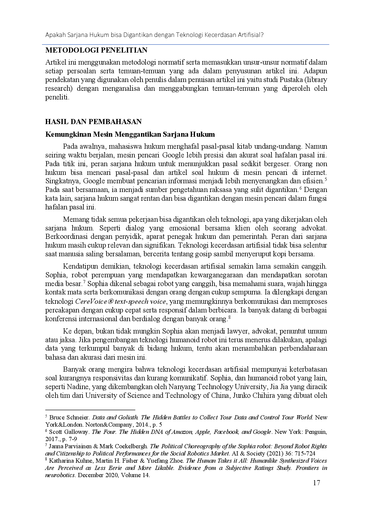 Perkembangan kecerdasan artifisial memungkin menggantikan posisi sarjana hukum.Di masa depan, peluang kerja para sarjana hukum kian menipis, dengan banyaknya efisiensi dan efektivitas yang lebih dijanjikan oleh mesin.Namun mempersiapkan supaya tidak banyak orang terluka karena kemajuan teknologi perlu disikapi dengan bijak.Berangkat hukum, mulai dari perizinan, pelindungan data pribadi, keamanan dan kepatuhan yang lain perlu diperhatikan bagi perusahaan teknologi.