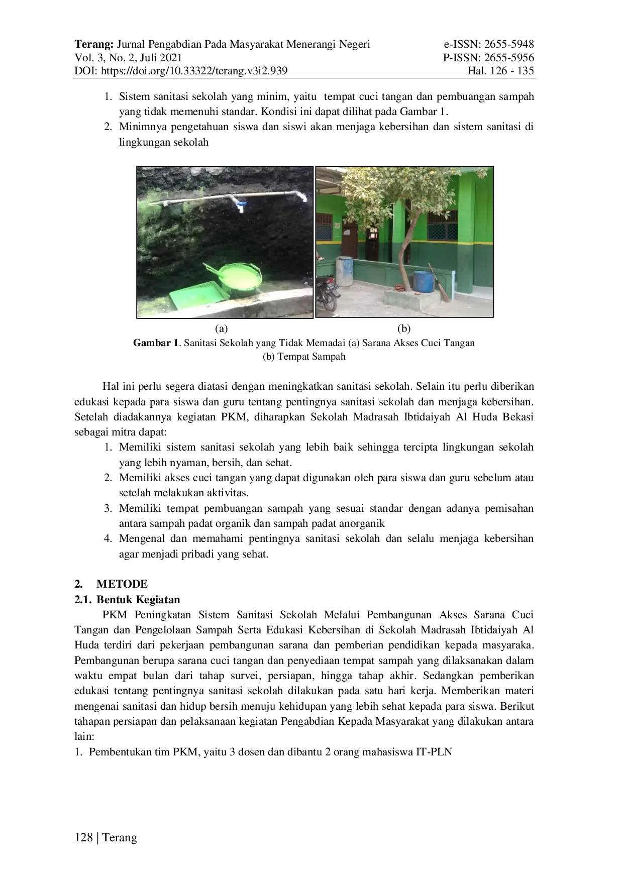 TERANGTERANGSanitasi sekolah merupakan sistem standar terjaminnya kesehatan dan pendidikan di lingkungan sekolah yang perlu ditingkatkan. Peningkatan sistem sanitasi meliputi pembangunan akses sarana cuci tangan dan tempat pembuangan sampah. Sekolah Madrasah Ibtidaiyah Al Huda merupakan sekolah sasaran mitra yang memiliki tingkat sanitasi sekolah yang masih rendah, yaitu terlihat dari minimnya akses cuci tangan dan tempat pembuangan sampah belum memenuhi syarat kesehatan. Selain itu diketahui juga tingkat pemahaman siswa-siswi terhadap sanitasi sekolah dan kebersihan masih rendah. Pengelolaan sampah, pembangunan akses cuci tangan, dan pemberian edukasi kepada para siswa dan guru Sekolah MI Al Huda bertujuan agar dapat meningkatkan sistem sanitasi sekolah. Perbaikan sarana akses cuci tangan yang dilengkapi dengan fasilitas lainnya seperti saluran air, atap, talang air, dan lantai serta penempatan tempat sampah organik-anorganik menciptakan lingkungan sekolah yang bersih, nyaman, dan sehat. Kegiatan edukasi meningkatkan pemahaman siswa-siswi tentang sanitasi dan kebersihan sebesar 38,46%. Kegiatan Pengabdian Kepada Masyarakat (PKM) berupa Peningkatan Sistem Sanitasi Sekolah Melalui Pembangunan Akses Sarana Cuci Tangan dan Pengelolaan Sampah Serta Edukasi Kebersihan, menjadikan para siswa dan guru Sekolah MI Al Huda terbiasa dalam hal menjaga kebersihan pribadi dan lingkungan sekolah.