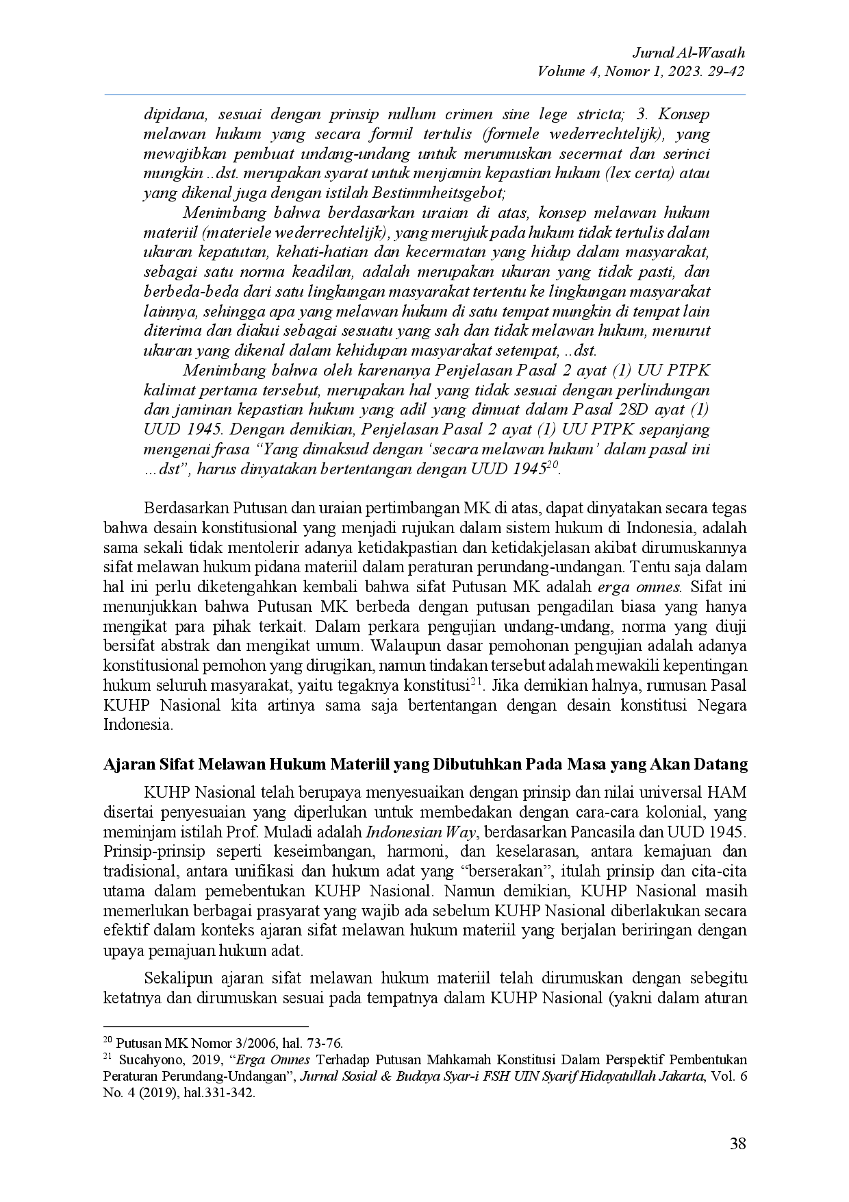 AL WASATH Jurnal Ilmu HukumAL WASATH Jurnal Ilmu HukumProses panjang penyusunan KUHP Nasional Indonesia telah selesai sejak Undang-Undang Nomor 1 Tahun 2023 tentang Kitab Undang-Undang Hukum Pidana (KUHP Nasional) disahkan dan diundangkan. Kritik masyarakat sebelum KUHP Nasional disahkan (pada saat masih dalam bentuk rancangan) terhadap keberadaan pengaturan terkait hukum yang hidup dalam masyarakat sebagaimana diatur dalam Pasal 2 KUHP Nasional, tidak mengubah apapun terhadap pengaturan dimaksud kecuali adanya penambahan satu ayat yang semula dua menjadi tiga. Sifat melawan hukum perbuatan pidana yang semula ada sepanjang diatur dalam aturan undang-undang, kini berkembang menjadi tidak semata berdasarkan aturan undang-undang tertulis, namun juga berdasarkan hukum yang hidup dalam masyarakat. Artikel ini menggunakan metode penelitian hukum normatif, artikel ini bermaksud menawarkan sebuah rekonstruksi terhadap pengaturan hukum yang ada dengan terlebih dahulu mengkaji apakah keberadaan pasal dimaksud telah sesuai dengan kaidah normatif dalam sistem hukum di Indonesia. Diperlukan upaya rekonstruksi pengaturan, yang dalam penelitian ini menunjukkan bahwa sifat melawan hukum materiil yang dibutuhkan di Indonesia saat ini dan yang akan datang bukanlah sifat melawan hukum materiil dalam fungsinya yang positif, namun lebih kepada sifat melawan hukum materiil dalam fungsinya yang negatif, sehingga pengaturan Pasal 2 KUHP Nasional perlu diubah dan dikoreksi dengan segera.