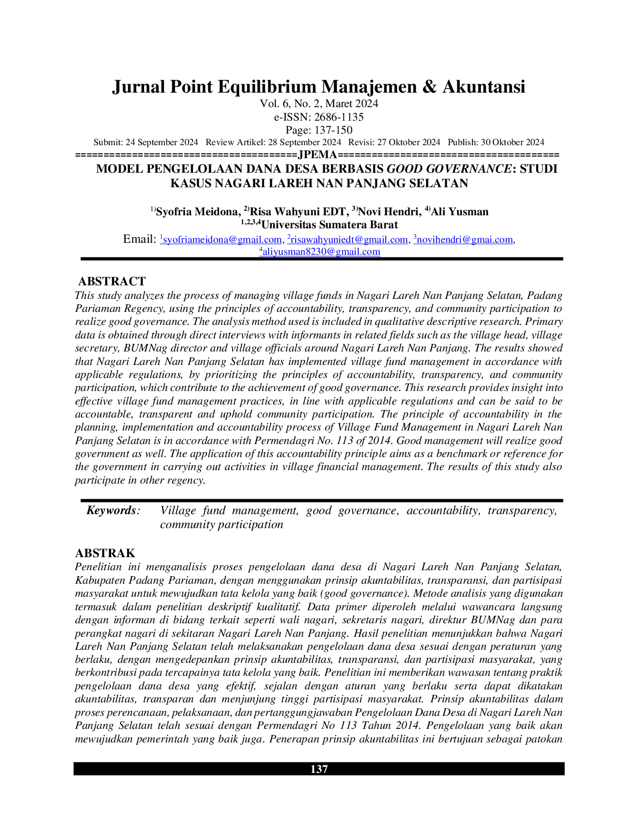 Berdasarkan Permendagri No 113 tahun 2014, Pengelolaan Dana Desa di Nagari Lareh Nan Panjang Selatan telah sesuai dengan aturan yang berlaku dan dapat dikatakan akuntabilitas, transparan dan menjunjung tinggi partisipasi masyarakat.Prinsip akuntabilitas dalam proses perencanaan, pelaksanaan, dan pertanggungjawaban Pengelolaan Dana Desa di Nagari Lareh Nan Panjang Selatan telah sesuai dengan Permendagri No 113 Tahun 2014.Pengelolaan yang baik akan mewujudkan pemerintah yang baik pula sehingga prinsip akuntabilitas dapat tercapai.Penerapan prinsip akuntabilitas ini bertujuan sebagai patokan atau acuan bagi pemerintah dalam melaksanakan kegiatan dalam pengelolaan keuangan desa.Prinsip transparansi juga sudah dilaksanakan dengan baik terbukti dengan terbukanya informasi di Nagari Lareh Nan Panjang.Prinsip pelaporan dan pertanggungjawaban Wali Nagari kepada Bupati Padang Pariaman sudah menggunakan format laporan pertanggungjawaban yang berlaku yaitu sesuai dengan Permendagri No 113 Tahun 2014, dan pemerintahan nagari telah menggunakan aplikasi SISKEUDES.Aplikasi ini membantu pemerintahan nagari dalam melakukan pelaporan dan pertanggungjawaban.Pemerintahan nagari juga telah memasang spanduk atau baliho di depan kantor nagari untuk mempublikasikan pada masyarakat, hal ini bertujuan agar masyarakat dapat mengetahui secara rinci terkait penggunaan dana desa.Prinsip partisipasi masyarakat dalam tahap perencanaan, pelaksanaan, pelaporan pertanggungjawaban Pengelolaan Dana Desa di Nagari Lareh Nan Panjang Selatan dapat dilihat dari kehadiran masyarakat yang menghadiri acara musyawarah yang dilakukan oleh nagari, dimana perangkat nagari mengundang tokoh masyarakat dan masyarakat lainnya yang ada di Nagari Lareh Nan Panjang Selatan.