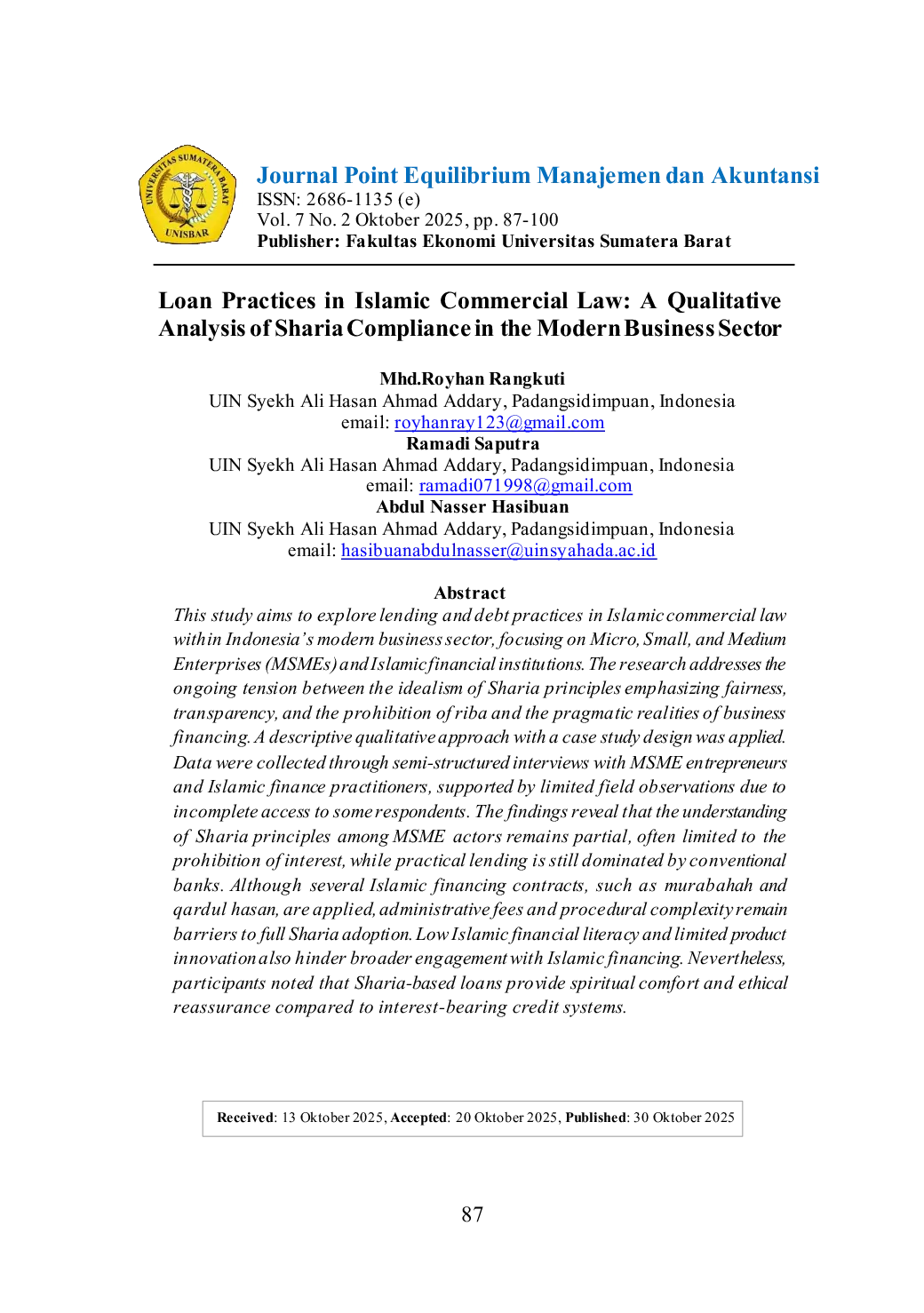 One moment, please...One moment, please...This study aims to explore lending and debt practices in Islamic commercial law within Indonesias modern business sector, focusing on Micro, Small, and Medium Enterprises (MSMEs) and Islamic financial institutions. The research addresses the ongoing tension between the idealism of Sharia principles emphasizing fairness, transparency, and the prohibition of riba and the pragmatic realities of business financing. A descriptive qualitative approach with a case study design was applied. Data were collected through semi-structured interviews with MSME entrepreneurs and Islamic finance practitioners, supported by limited field observations due to incomplete access to some respondents. The findings reveal that the understanding of Sharia principles among MSME actors remains partial, often limited to the prohibition of interest, while practical lending is still dominated by conventional banks. Although several Islamic financing contracts, such as murabahah and qardul hasan, are applied, administrative fees and procedural complexity remain barriers to full Sharia adoption. Low Islamic financial literacy and limited product innovation also hinder broader engagement with Islamic financing. Nevertheless, participants noted that Sharia-based loans provide spiritual comfort and ethical reassurance compared to interest-bearing credit systems.