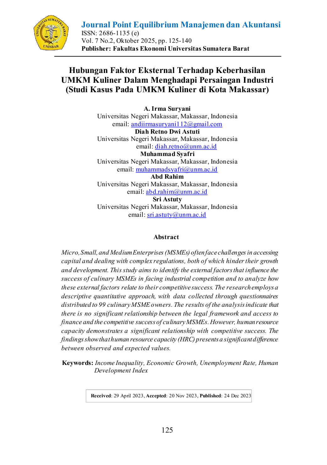One moment, please...One moment, please...Micro, Small, and Medium Enterprises (MSMEs) sering menghadapi tantangan dalam mengakses modal dan berurusan dengan peraturan yang kompleks, yang menghambat pertumbuhan dan perkembangan mereka. Penelitian ini bertujuan untuk mengidentifikasi faktor eksternal yang mempengaruhi keberhasilan UMKM kuliner dalam menghadapi persaingan industri dan menganalisis bagaimana faktor eksternal tersebut berhubungan dengan kesuksesan mereka dalam persaingan. Penelitian ini menggunakan pendekatan deskriptif kuantitatif, dengan data dikumpulkan melalui kuesioner yang didistribusikan kepada 99 pemilik UMKM kuliner. Hasil analisis menunjukkan bahwa tidak ada hubungan yang signifikan antara kerangka hukum dan akses ke pendanaan terhadap kesuksesan bersaing UMKM kuliner. Namun, kapasitas sumber daya manusia menunjukkan hubungan yang signifikan dengan kesuksesan bersaing. Temuan menunjukkan bahwa kapasitas sumber daya manusia (KSDM) menunjukkan perbedaan signifikan antara nilai observasi dan ekspektasi.