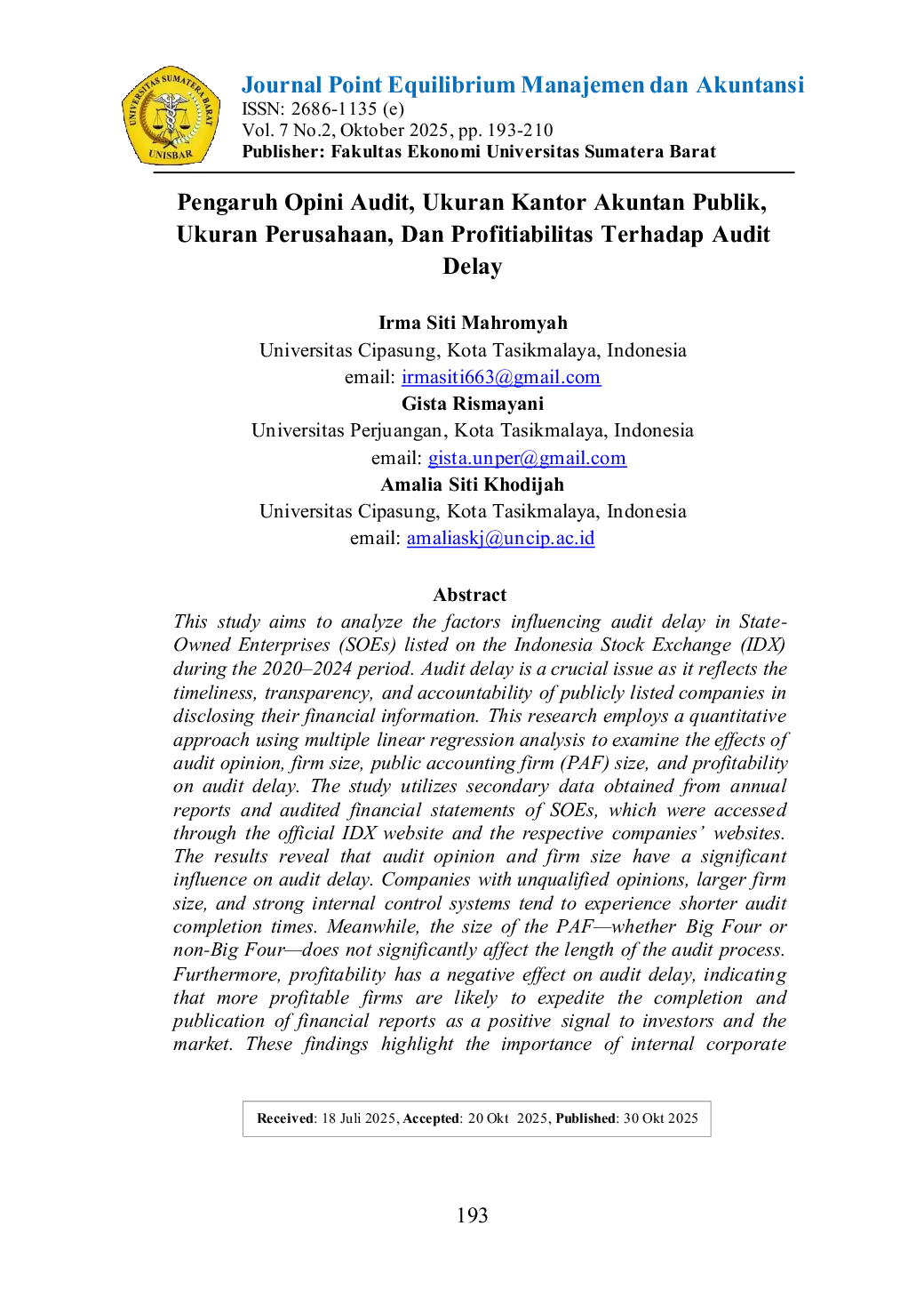 One moment, please...One moment, please...Penelitian ini bertujuan untuk menganalisis faktor-faktor yang memengaruhi audit delay pada perusahaan Badan Usaha Milik Negara (BUMN) yang terdaftar di Bursa Efek Indonesia (BEI) selama periode 2020–2024. Audit delay menjadi isu penting karena berkaitan dengan ketepatan waktu penyampaian laporan keuangan yang mencerminkan tingkat transparansi dan akuntabilitas perusahaan publik. Penelitian ini menggunakan pendekatan kuantitatif dengan metode analisis regresi linier berganda untuk menguji pengaruh opini audit, ukuran perusahaan, ukuran Kantor Akuntan Publik (KAP), dan profitabilitas terhadap audit delay. Hasil penelitian menunjukkan bahwa opini audit dan ukuran perusahaan berpengaruh signifikan terhadap audit delay. Perusahaan dengan opini wajar tanpa pengecualian (WTP), ukuran besar, serta sistem pengendalian internal yang kuat cenderung memiliki waktu penyelesaian audit yang lebih singkat. Sementara itu, ukuran KAP, baik Big Four maupun non-Big Four, tidak menunjukkan perbedaan yang signifikan dalam memengaruhi lamanya proses audit. Selain itu, profitabilitas berpengaruh negatif terhadap audit delay, di mana perusahaan dengan profitabilitas tinggi cenderung mempercepat penerbitan laporan keuangan sebagai bentuk sinyal positif kepada investor dan publik. Temuan ini memperkuat pentingnya faktor internal perusahaan dalam mempercepat proses audit dan meningkatkan transparansi laporan keuangan di lingkungan BUMN.