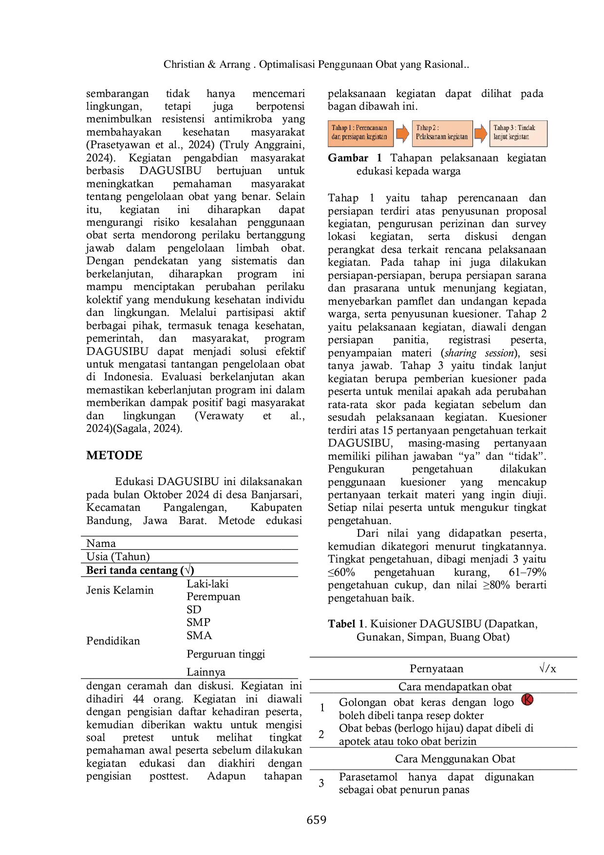 Program DAGUSIBU berhasil meningkatkan pengetahuan peserta tentang pengelolaan obat, dengan hasil posttest menunjukkan peningkatan kategori baik dari 15,91% menjadi 38,64%.Edukasi ini efektif dalam memperkenalkan cara mendapatkan, menggunakan, menyimpan, dan membuang obat yang relevan bagi masyarakat, terutama dalam peran keluarga.Evaluasi untuk pengembangan ke depan, disarankan penggunaan media visual, simulasi praktis, dan diskusi kelompok untuk meningkatkan interaktivitas.Pendekatan berbasis komunitas dengan melibatkan tokoh lokal dan sesi tindak lanjut juga penting untuk memperkuat penerapan konsep DAGUSIBU dalam kehidupan sehari-hari.Strategi ini diharapkan dapat semakin meningkatkan literasi kesehatan masyarakat dan mendorong perubahan perilaku yang lebih baik.