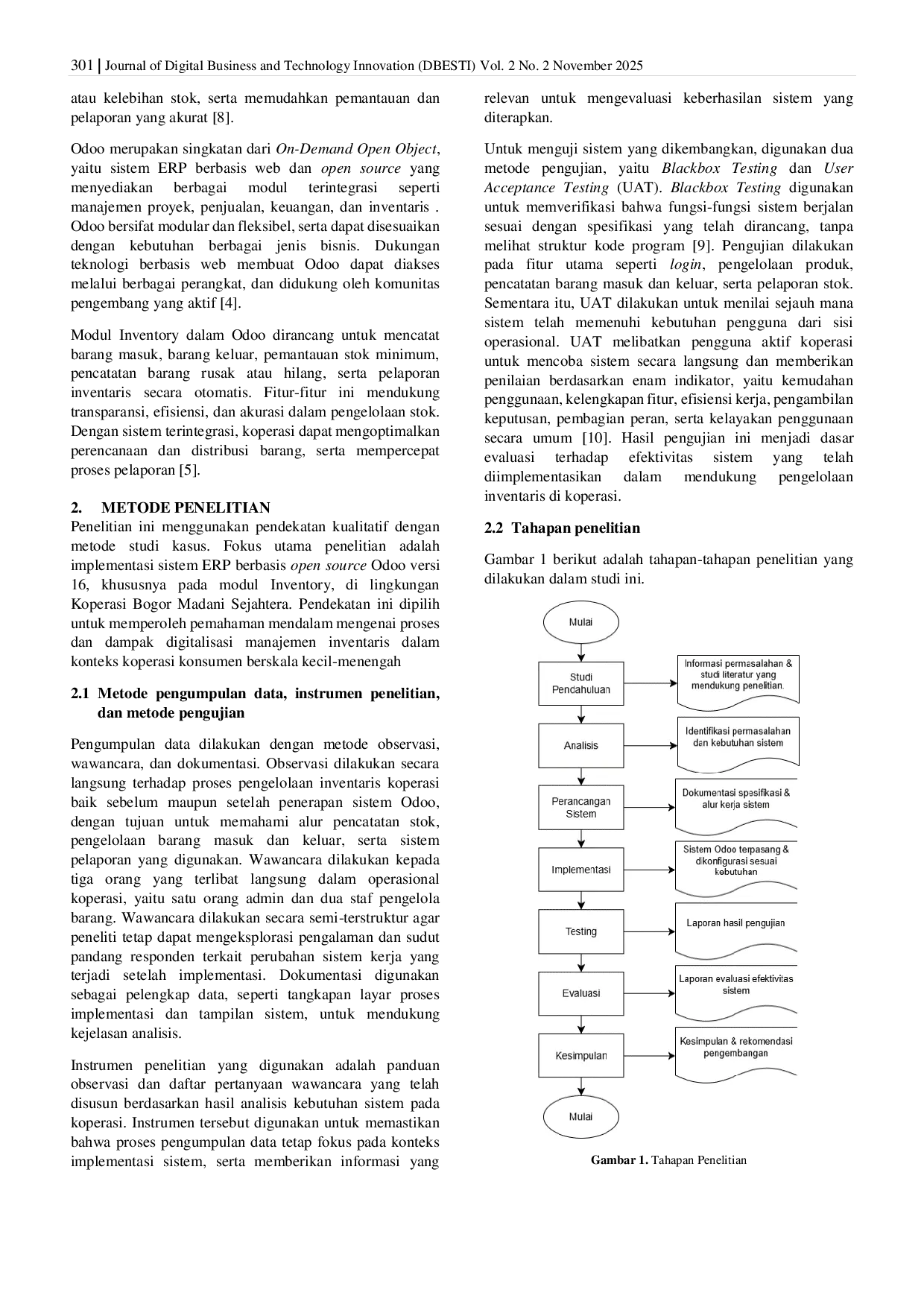 DBESTI: Journal of Digital Business and Technology InnovationDBESTI: Journal of Digital Business and Technology InnovationPenelitian ini membahas penerapan modul Inventory pada sistem Enterprise Resource Planning (ERP) berbasis Odoo sebagai solusi digitalisasi pengelolaan inventaris di Koperasi Bogor Madani Sejahtera. Penggunaan pencatatan manual sebelumnya sering menimbulkan ketidaksesuaian data, keterlambatan laporan, serta kesulitan dalam memantau ketersediaan barang secara real time. Penelitian ini bertujuan meningkatkan efisiensi dan akurasi pencatatan stok melalui sistem yang lebih terintegrasi. Pendekatan yang digunakan adalah studi kasus dengan metode kualitatif. Metode pengumpulan data dilakukan melalui observasi, wawancara, dan dokumentasi. Analisis data dilakukan secara deskriptif dengan membandingkan kondisi sebelum dan sesudah implementasi sistem. Sistem dibangun menggunakan Odoo versi 16 dengan fokus pada modul Inventory, dan diuji menggunakan metode Blackbox Testing serta User Acceptance Testing (UAT) yang melibatkan admin dan karyawan koperasi. Hasil penelitian menunjukkan bahwa sistem berjalan sesuai kebutuhan koperasi, khususnya dalam pencatatan transaksi, pemantauan stok, dan pelaporan. Secara umum, penerapan sistem ini mampu meningkatkan efisiensi operasional, mendukung ketepatan data, dan mempermudah proses pengambilan keputusan. Dengan demikian, digitalisasi melalui Odoo dinilai efektif dalam menunjang pengelolaan inventaris koperasi secara menyeluruh.