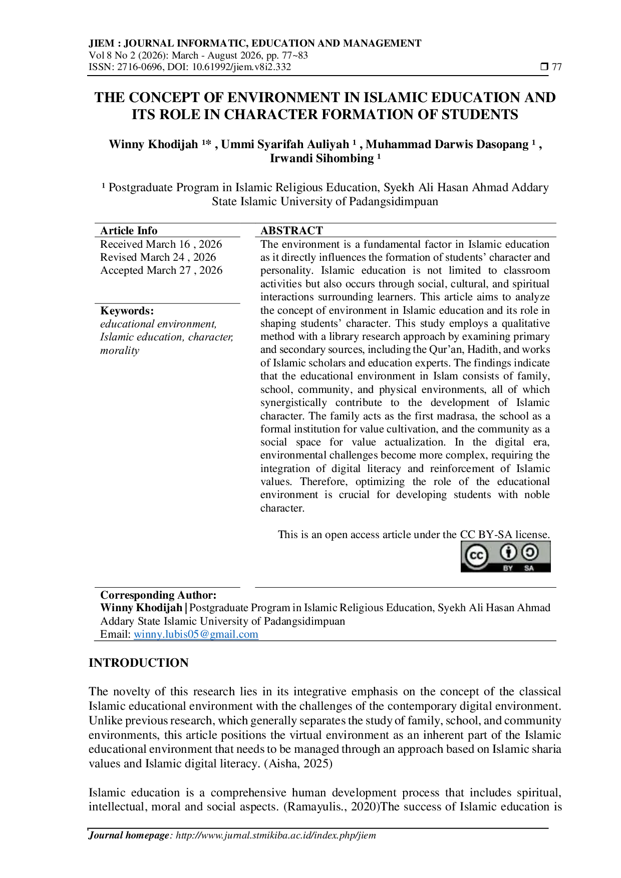 Journal Informatic, Education and Management (JIEM)Journal Informatic, Education and Management (JIEM)The environment is a fundamental factor in Islamic education as it directly influences the formation of students character and personality. Islamic education is not limited to classroom activities but also occurs through social, cultural, and spiritual interactions surrounding learners. This article aims to analyze the concept of environment in Islamic education and its role in shaping students character. This study employs a qualitative method with a library research approach by examining primary and secondary sources, including the Quran, Hadith, and works of Islamic scholars and education experts. The findings indicate that the educational environment in Islam consists of family, school, community, and physical environments, all of which synergistically contribute to the development of Islamic character. The family acts as the first madrasa, the school as a formal institution for value cultivation, and the community as a social space for value actualization. In the digital era, environmental challenges become more complex, requiring the integration of digital literacy and reinforcement of Islamic values. Therefore, optimizing the role of the educational environment is crucial for developing students with noble character.
