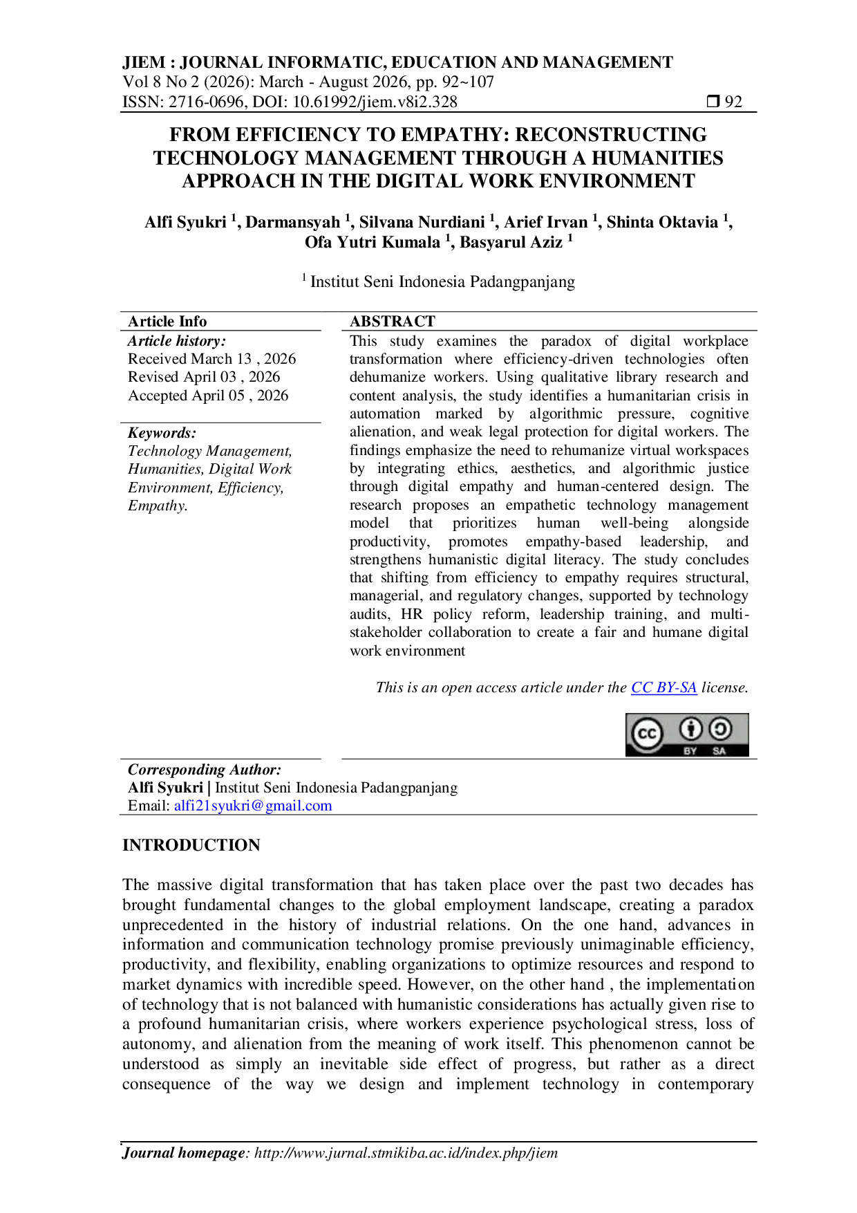 Journal Informatic, Education and Management (JIEM)Journal Informatic, Education and Management (JIEM)Penelitian ini mengkaji paradoks transformasi tempat kerja digital di mana teknologi yang didorong efisiensi seringkali mendepersonalisasi pekerja. Dengan menggunakan penelitian pustaka kualitatif dan analisis konten, penelitian ini mengidentifikasi krisis kemanusiaan dalam otomasi yang ditandai dengan tekanan algoritmik, alienasi kognitif, dan perlindungan hukum yang lemah bagi pekerja digital. Temuan penelitian ini menekankan kebutuhan untuk menghumanisasi kembali ruang kerja virtual dengan mengintegrasikan etika, estetika, dan keadilan algoritmik melalui empati digital dan desain yang berpusat pada manusia. Penelitian ini mengusulkan model manajemen teknologi empati yang mempromosikan produktivitas dan memperkuat literasi digital humanistik. Penelitian ini menyimpulkan bahwa pergeseran dari efisiensi ke empati memerlukan perubahan struktural, manajerial, dan regulasi, yang didukung oleh audit teknologi, reformasi kebijakan SDM, pelatihan kepemimpinan, dan kolaborasi multi-pemangku kepentingan untuk menciptakan lingkungan kerja digital yang adil dan manusiawi.