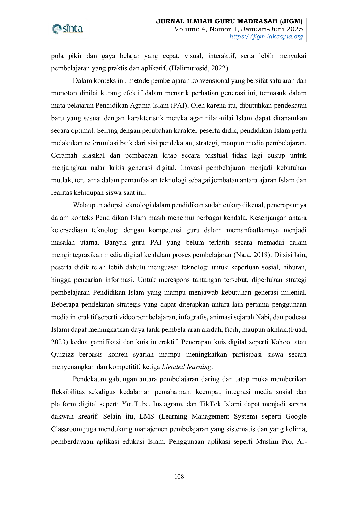 Jurnal Ilmiah Guru MadrasahJurnal Ilmiah Guru MadrasahPerkembangan teknologi digital telah mendorong transformasi signifikan dalam dunia pendidikan, termasuk dalam pendidikan Islam. Generasi milenial yang lahir dan tumbuh di tengah kemajuan teknologi menuntut metode pembelajaran yang adaptif, interaktif, dan relevan dengan dunia digital yang mereka kenal. Penelitian ini bertujuan untuk mengkaji strategi pembelajaran pendidikan Islam berbasis teknologi yang efektif dalam menjawab kebutuhan generasi tersebut. Metode penelitian yang digunakan adalah studi pustaka (library research) dengan pendekatan deskriptif-analitis terhadap berbagai literatur terkait. Hasil analisis menunjukkan bahwa integrasi teknologi digital seperti e-learning, media sosial, aplikasi pembelajaran berbasis mobile, serta platform interaktif mampu meningkatkan motivasi belajar dan pemahaman peserta didik terhadap nilai-nilai Islam. Strategi seperti blended learning, gamifikasi materi keagamaan, serta pemanfaatan media dakwah digital seperti video dan podcast Islami terbukti efektif dalam menciptakan pembelajaran yang menarik dan bermakna, penelitian ini dapat memberikan alternatif model pembelajaran pendidikan Islam yang sesuai dengan karakteristik generasi milenial. Penelitian ini juga dapat menjadi rujukan bagi para pendidik, pengembang kurikulum, serta lembaga pendidikan Islam untuk merancang strategi pembelajaran yang lebih inovatif dan responsif terhadap perkembangan zaman. Dengan demikian, pendidikan Islam tidak hanya tetap relevan, tetapi juga mampu menjadi kekuatan transformatif dalam membentuk generasi muda yang religius dan melek teknologi.