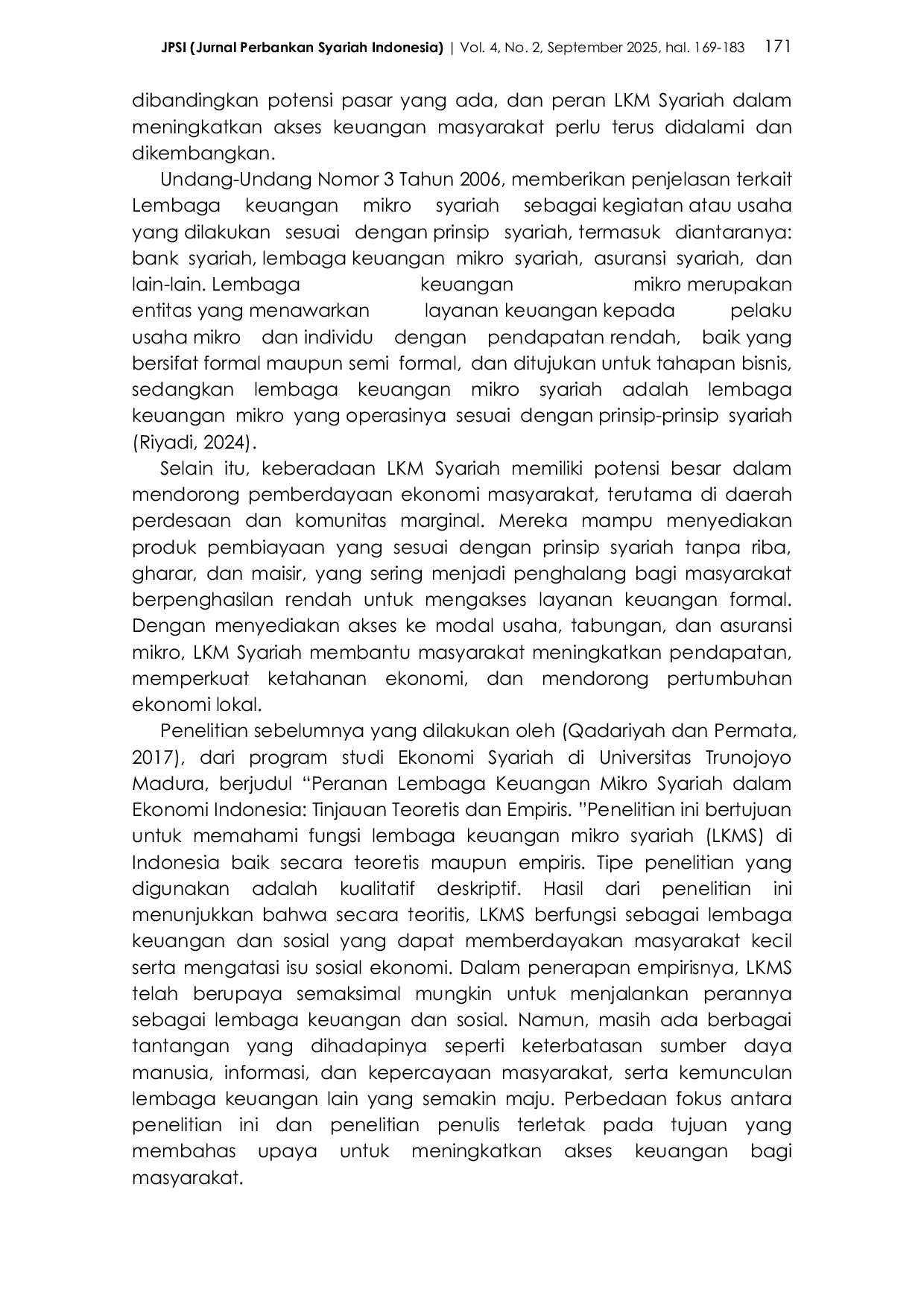 Lembaga Keuangan Mikro Syariah berperan penting dalam meningkatkan akses keuangan masyarakat, terutama melalui penyediaan produk berbasis syariah yang sesuai kebutuhan dan nilai-nilai budaya masyarakat.Keberadaan LKM Syariah membantu masyarakat mengatasi keterbatasan akses ke layanan keuangan formal, memberikan modal untuk usaha, meningkatkan pendapatan, dan memperkuat modal sosial.Kendala berupa keterbatasan dana, SDM, dan pemahaman masyarakat perlu mendapatkan perhatian serius agar potensi lembaga ini dapat dimaksimalkan secara optimal.Peningkatan kapasitas pengelola dan edukasi masyarakat tentang prinsip syariah menjadi langkah strategis yang harus dilakukan agar layanan keuangan mikro syariah dapat berkembang dan memberikan manfaat yang lebih luas di masa mendatang.