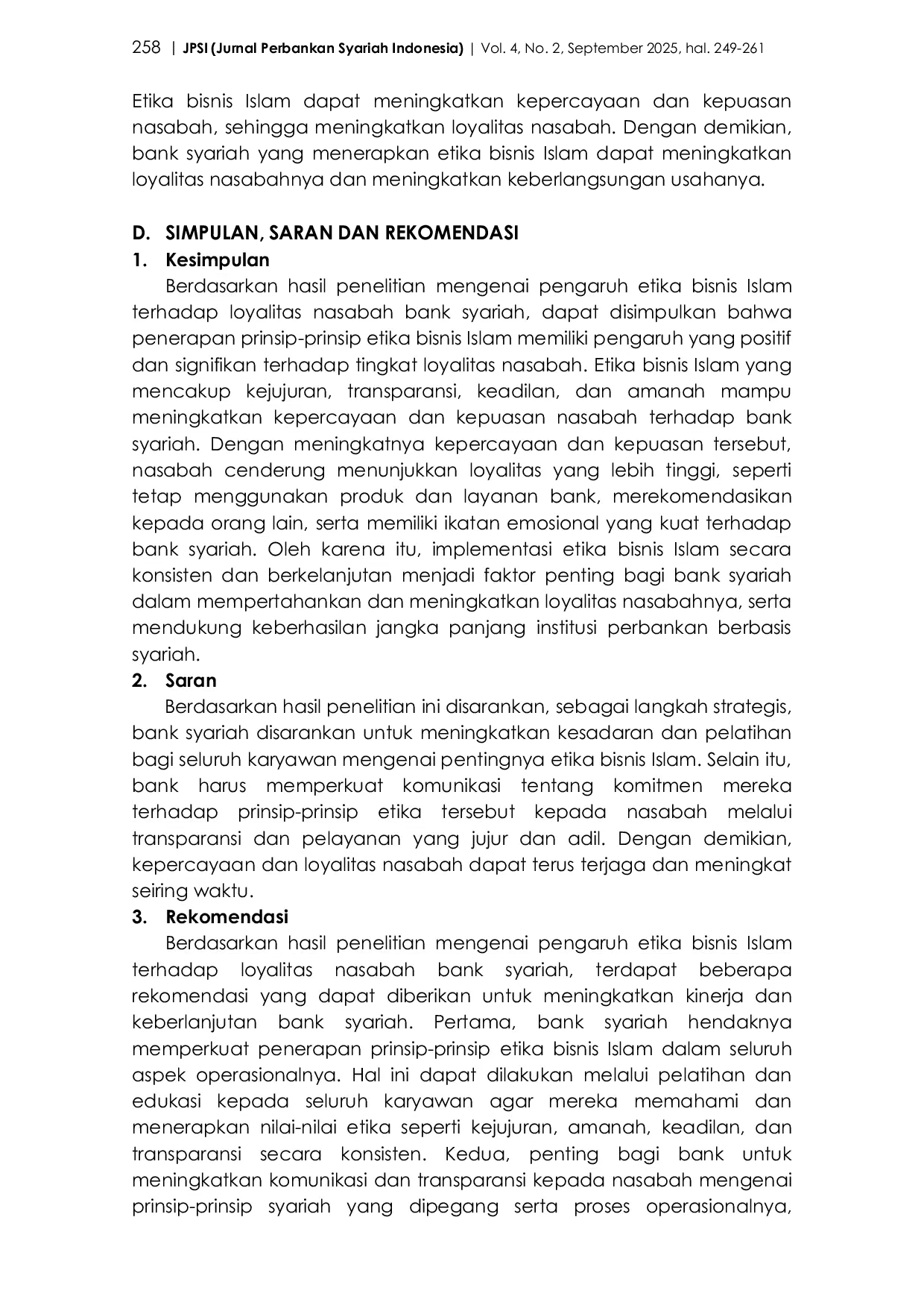 Penerapan prinsip-prinsip etika bisnis Islam memiliki pengaruh yang positif dan signifikan terhadap tingkat loyalitas nasabah.Prinsip seperti kejujuran, transparansi, keadilan, dan amanah mampu meningkatkan kepercayaan dan kepuasan nasabah terhadap bank syariah.Dengan demikian, implementasi etika bisnis Islam secara konsisten menjadi faktor penting dalam mempertahankan dan meningkatkan loyalitas nasabah serta mendukung keberhasilan jangka panjang bank syariah.
